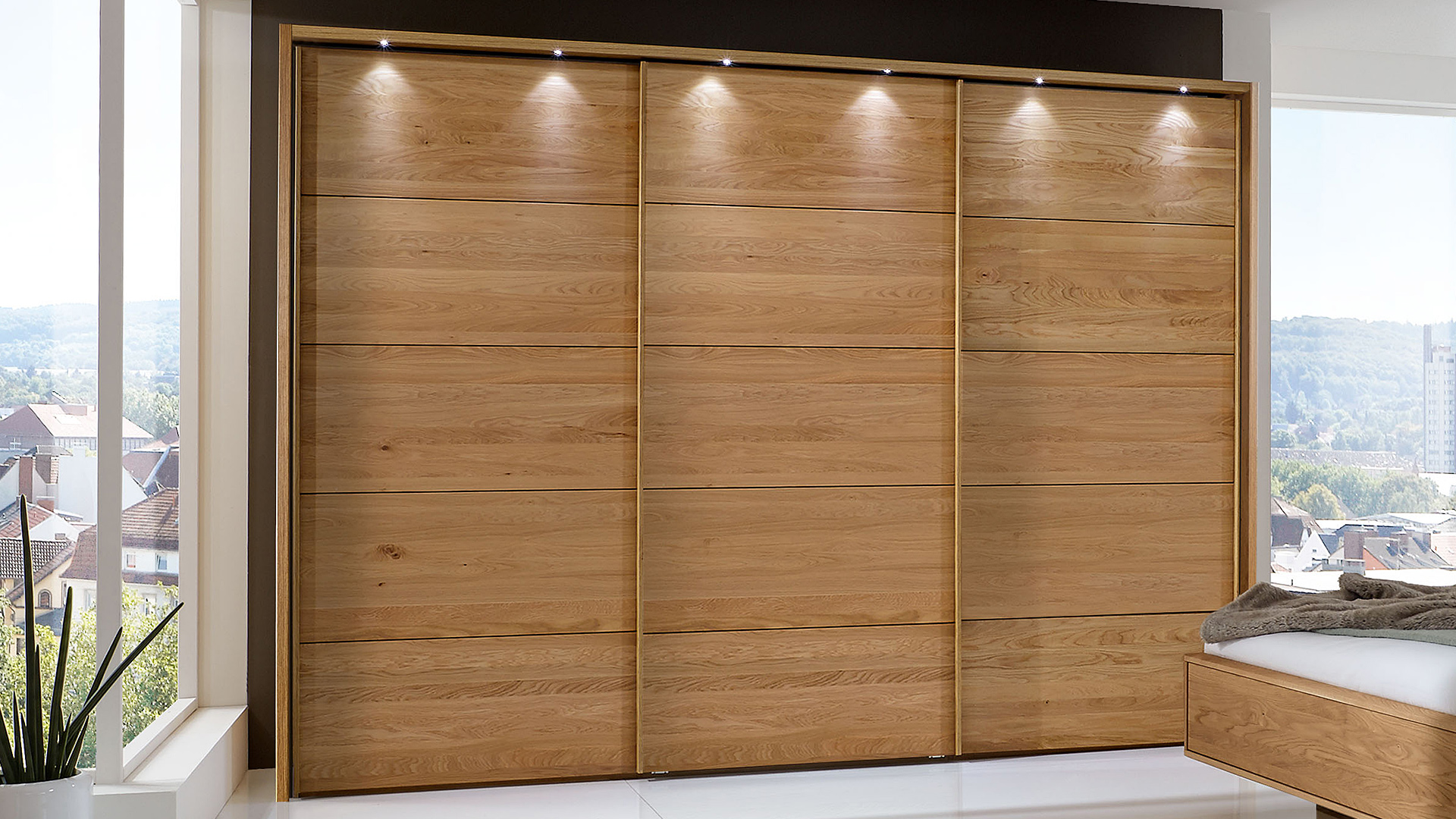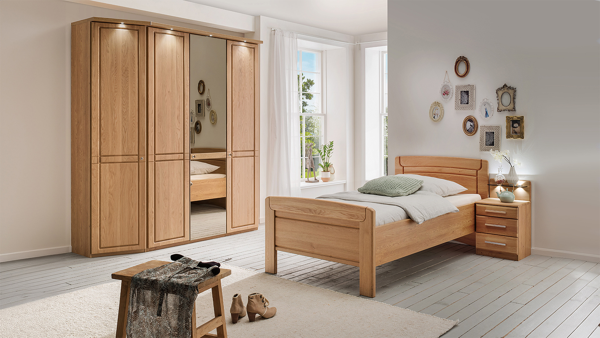 Natürliche Korpus- und Frontausführungen aus teilmassiver Eiche sorgen für ein warmes Wohnambiente und bereichern dank edler Einfräsungen in Schrankfront und Bettkopfteil Ihr individuelles Schlafzimmerdesign.