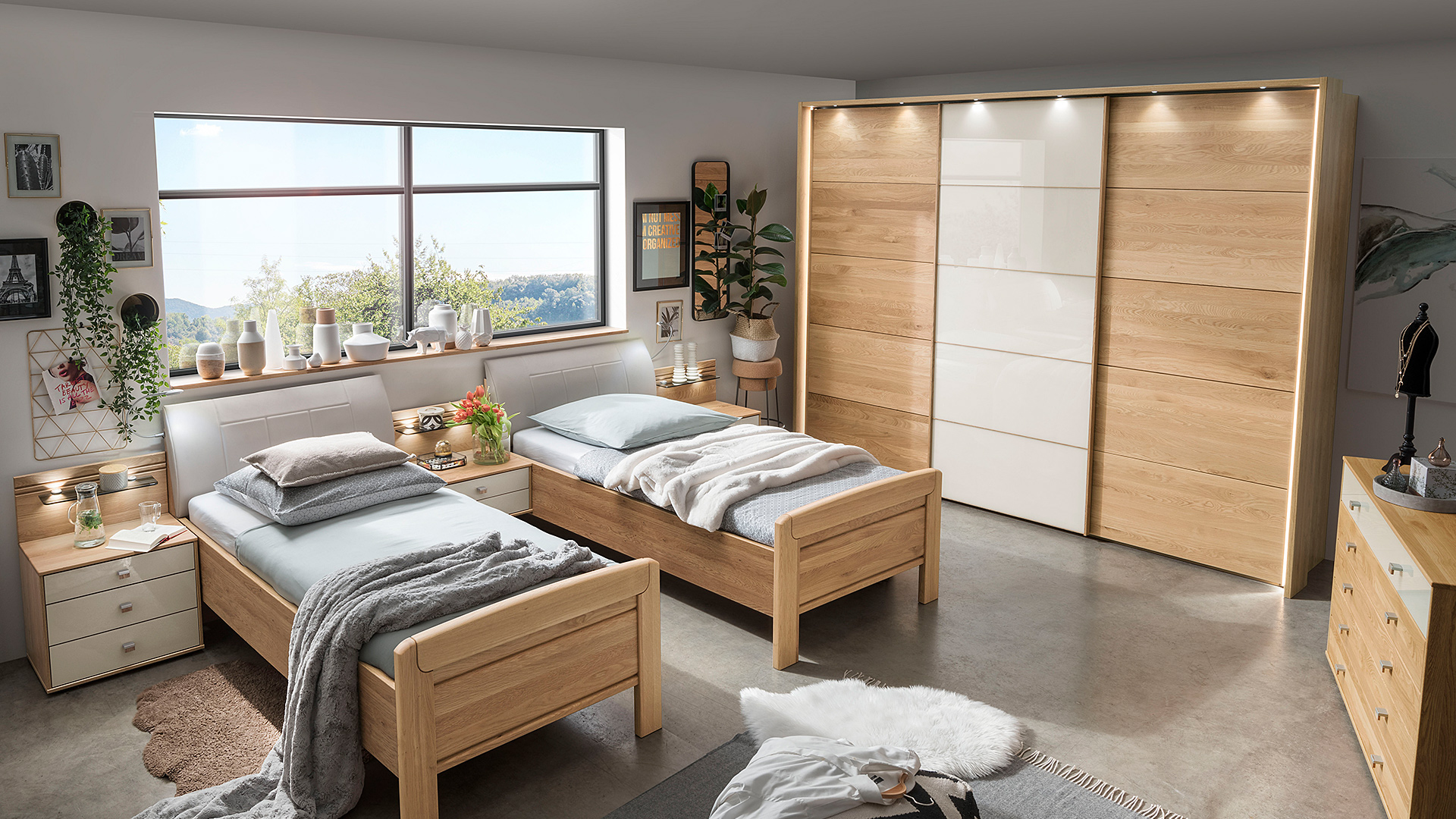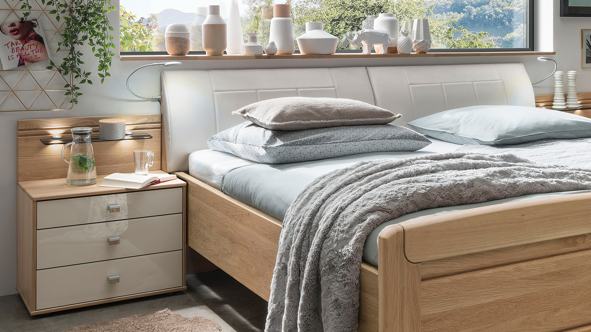 Passend zu den Schränken und Betten bietet KIRUNA eine Vielzahl an Beimöbeln. Die Nachtschränke und Kommoden sind wahlweise mit Massivholzfronten oder mit Glasfronten in Champagner erhältlich. Die Nachtschränke sind in verschiedenen Ausführungen verfügbar und können mit LED-Beleuchtung ausgestattet werden, um dezente Lichtakzente zu setzen. Auch die Kommoden bieten großzügigen Stauraum und überzeugen durch klare Linien und eine hochwertige Verarbeitung.