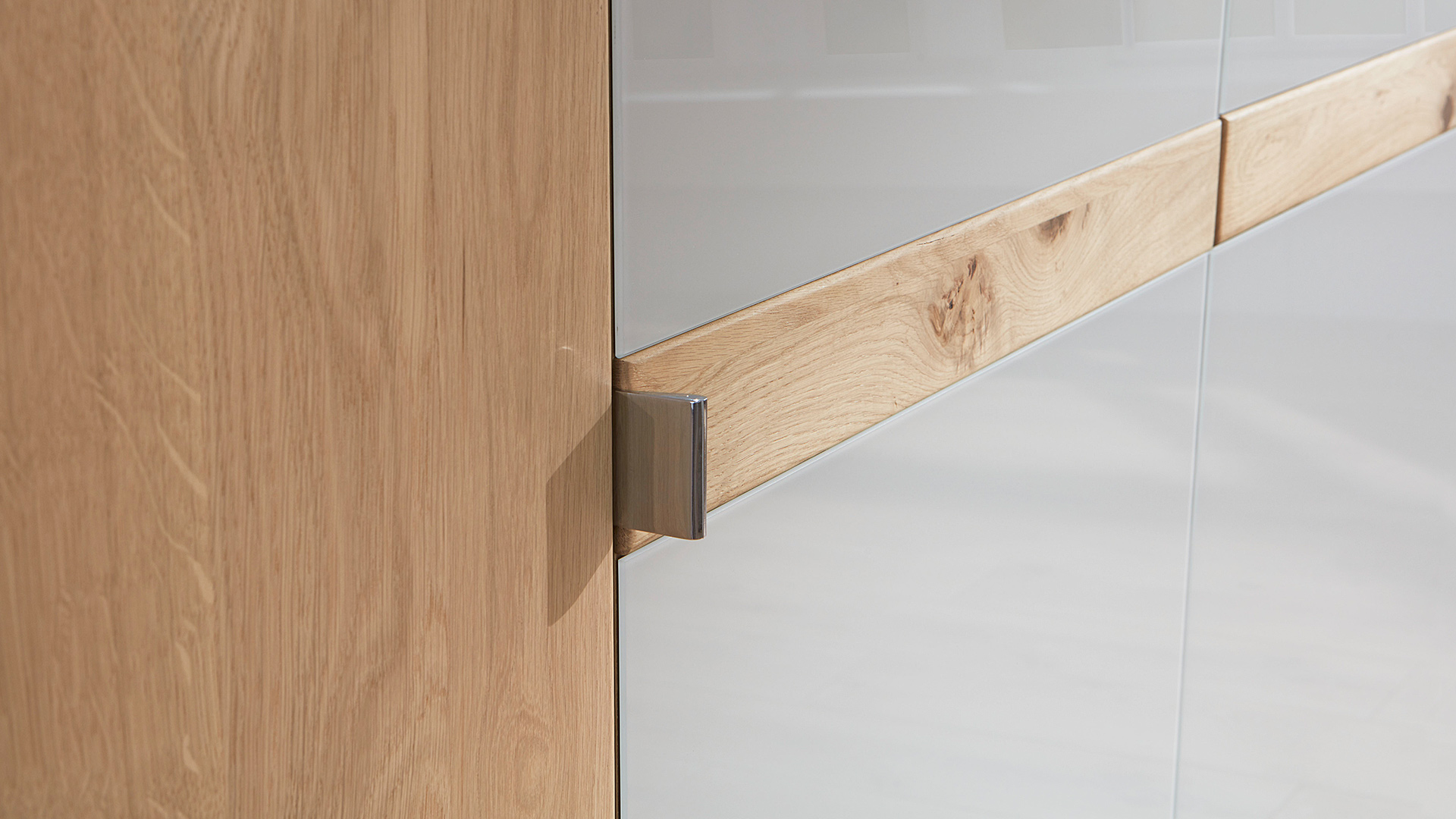 Verfügbar in zwei unterschiedlichen Höhen und acht Breiten, passen sich die Fronten der Drehtürenschränke in Bianco-Eiche massiv, wahlweise kombiniert mit Kristallspiegeltüren oder Glastüren, Ihrem persönlichen Wohnstil an. Wenn der Kleiderschrank noch mehr in Glanz erscheinen soll, wählen Sie einfach eine Front komplett mit Glastüren. Ein besonderes Highlight ist der massive Querriegel in den Glas- bzw. Spiegelfronten, der in liebevoller Handarbeit eingearbeitet wird.