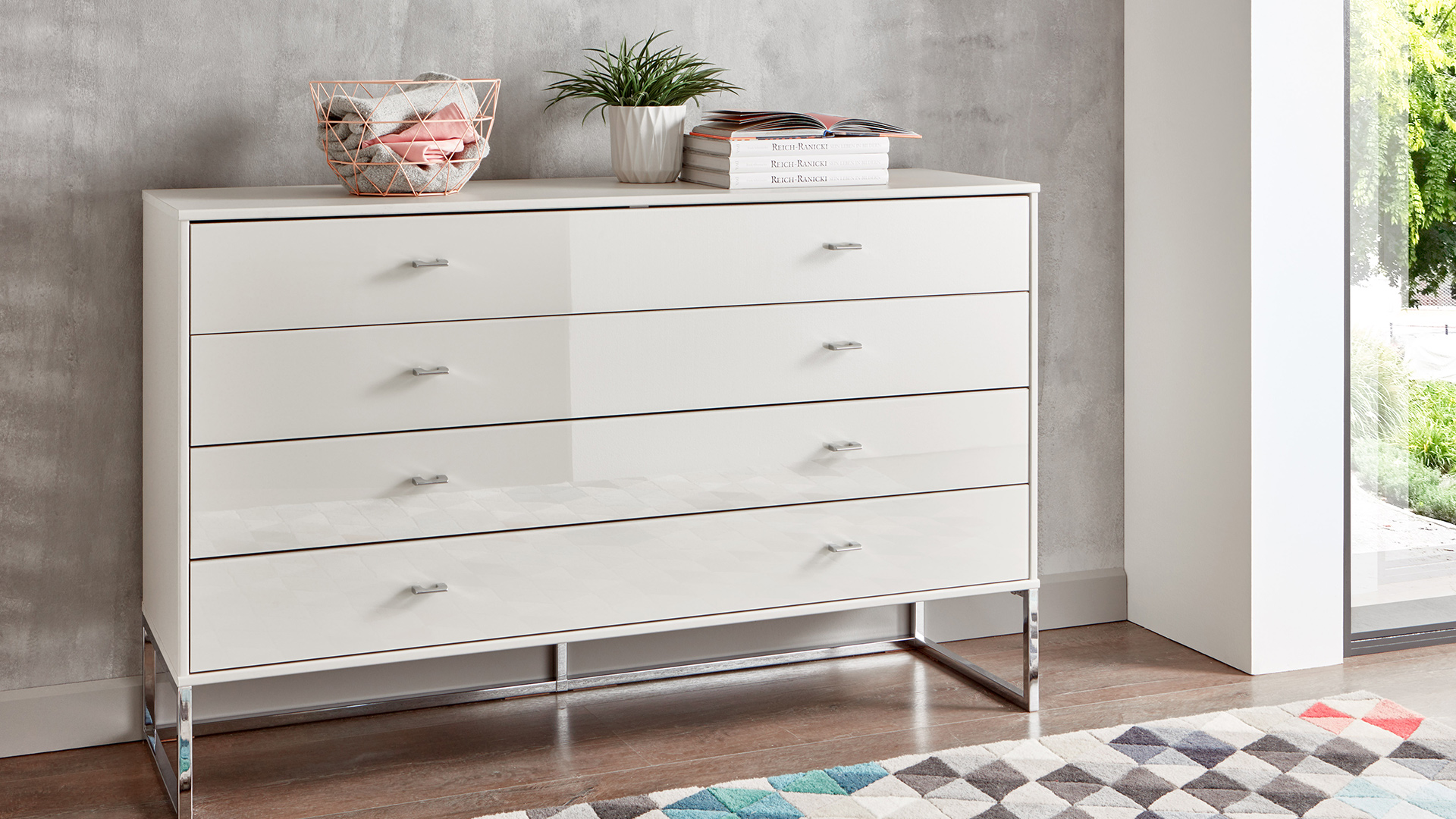- Nachtschränke und Kommoden mit Chromkufen oder schwarzen Gleitfüßen