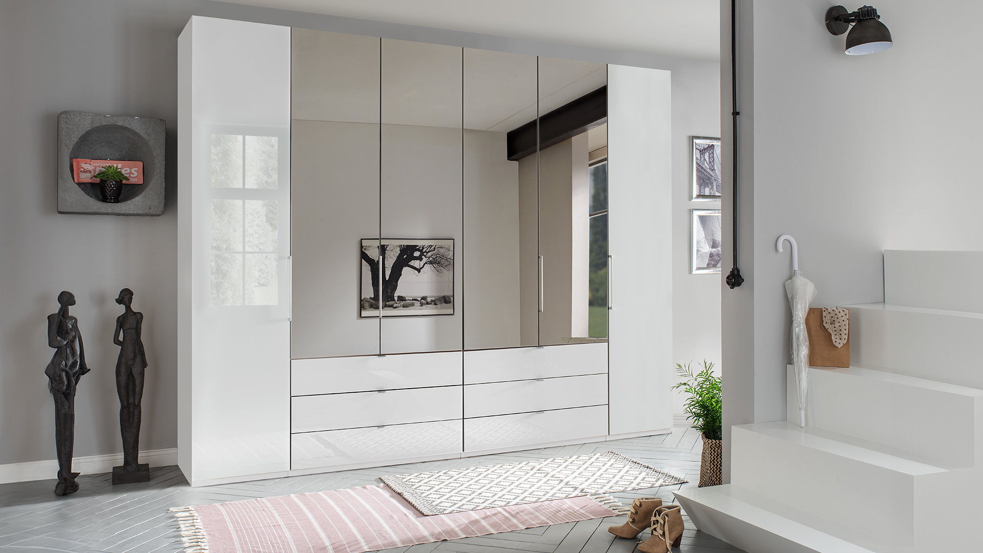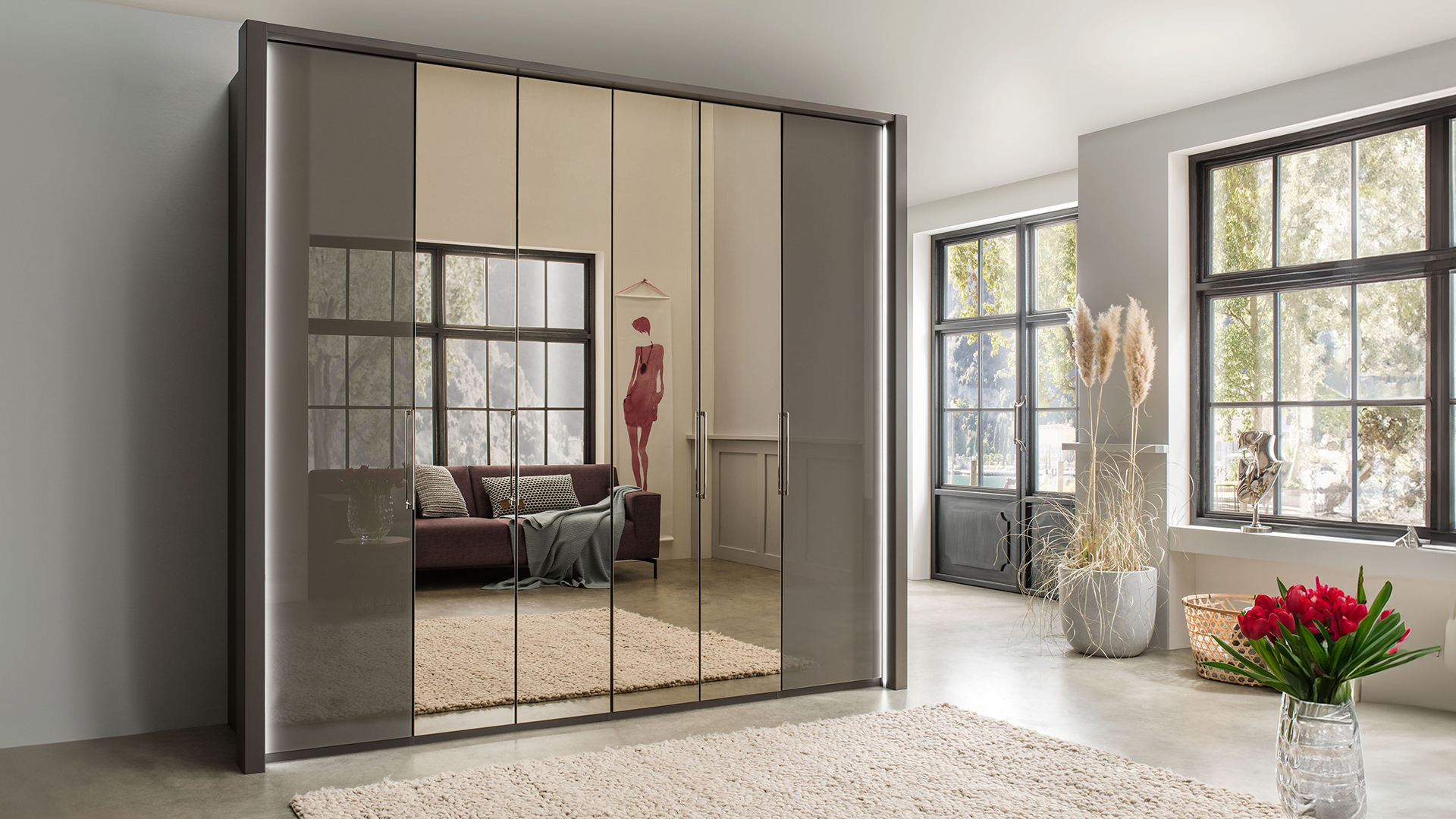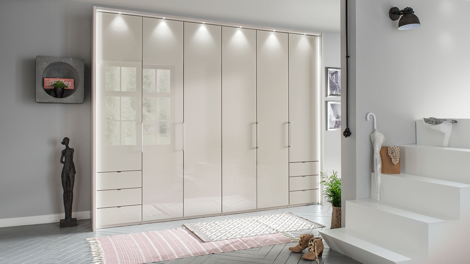Zur Auswahl stehen drei Korpusfarben und ebenso viele Glasfarben für die Frontgestaltung. Die Falttüren-Panorama-Schränke mit automatischer Türöffnung sind in den Breiten von 150 cm bis 400 cm und in zwei Höhen, 216 und 236 cm, erhältlich. Alle Schränke sind wahlweise mit Kristallspiegeln und / oder Auszügen erhältlich. Die Sockelaufteilung ermöglicht Ihnen in jedem Fall eine optimale Sicht auf das Innere Ihres Schranks - genießen Sie Ihr ganz persönliches Schrank-Panorama!