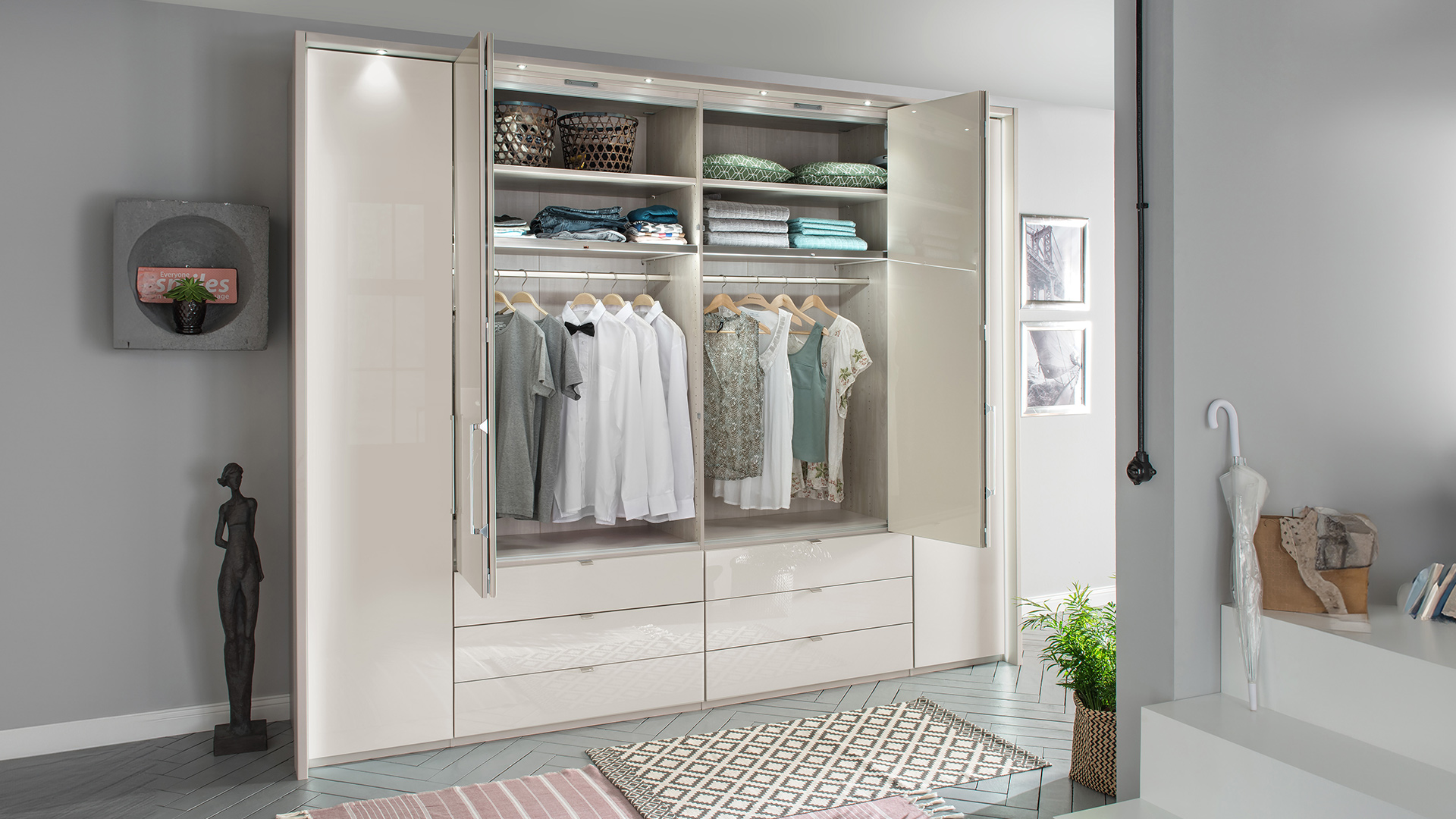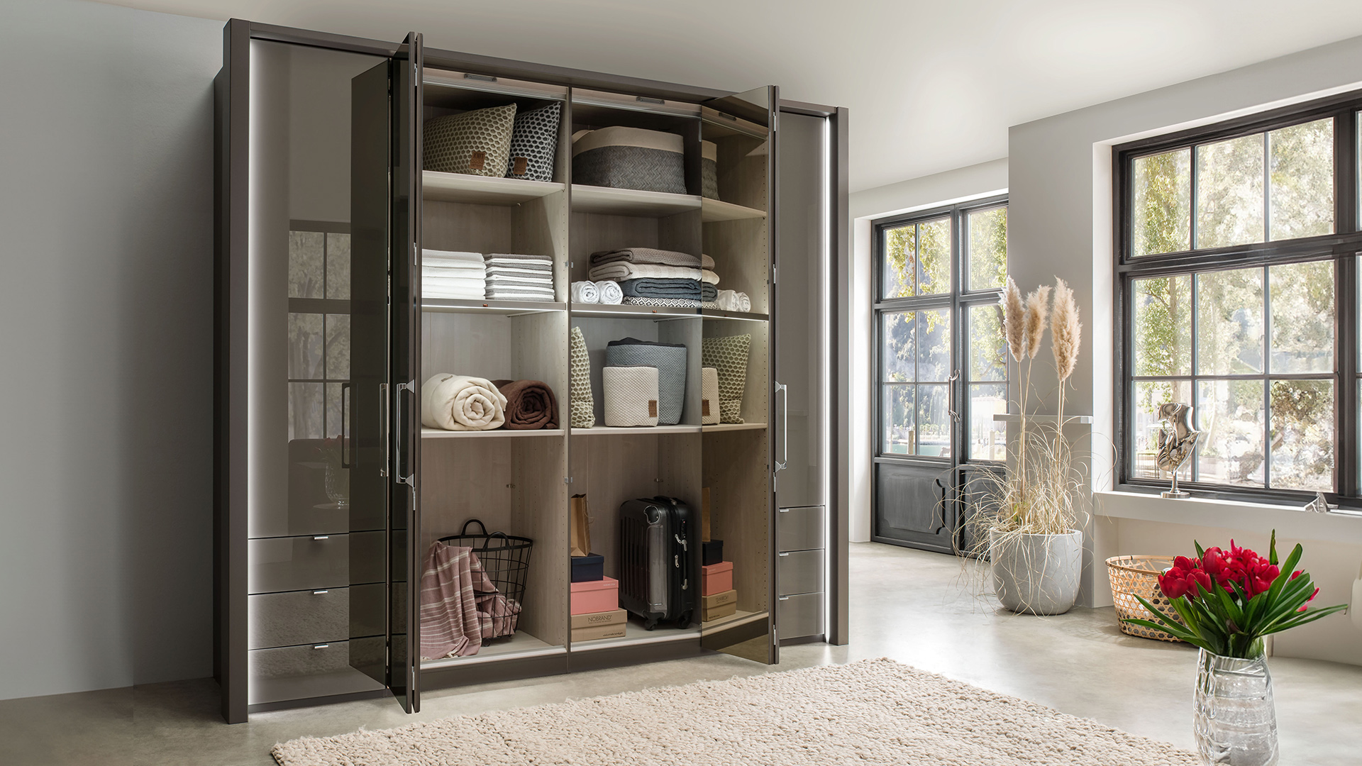 Das Schlafzimmerprogramm KANSAS vereint modernste Technik und stilvolles Design. Sie müssen nur leicht am Griff ziehen und schon öffnet sich die Falttür automatisch!