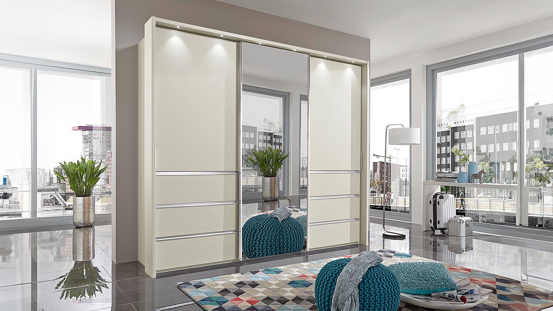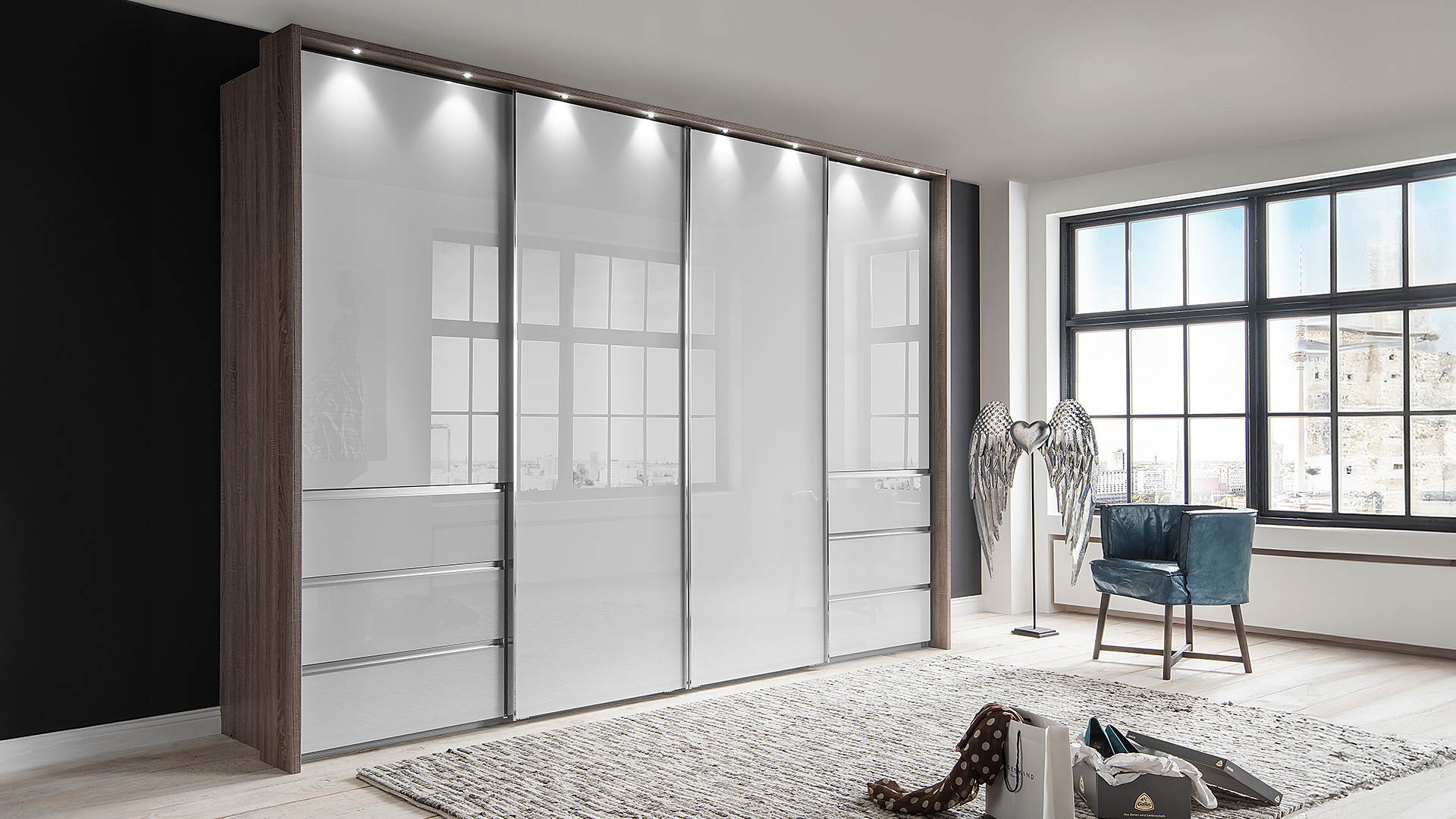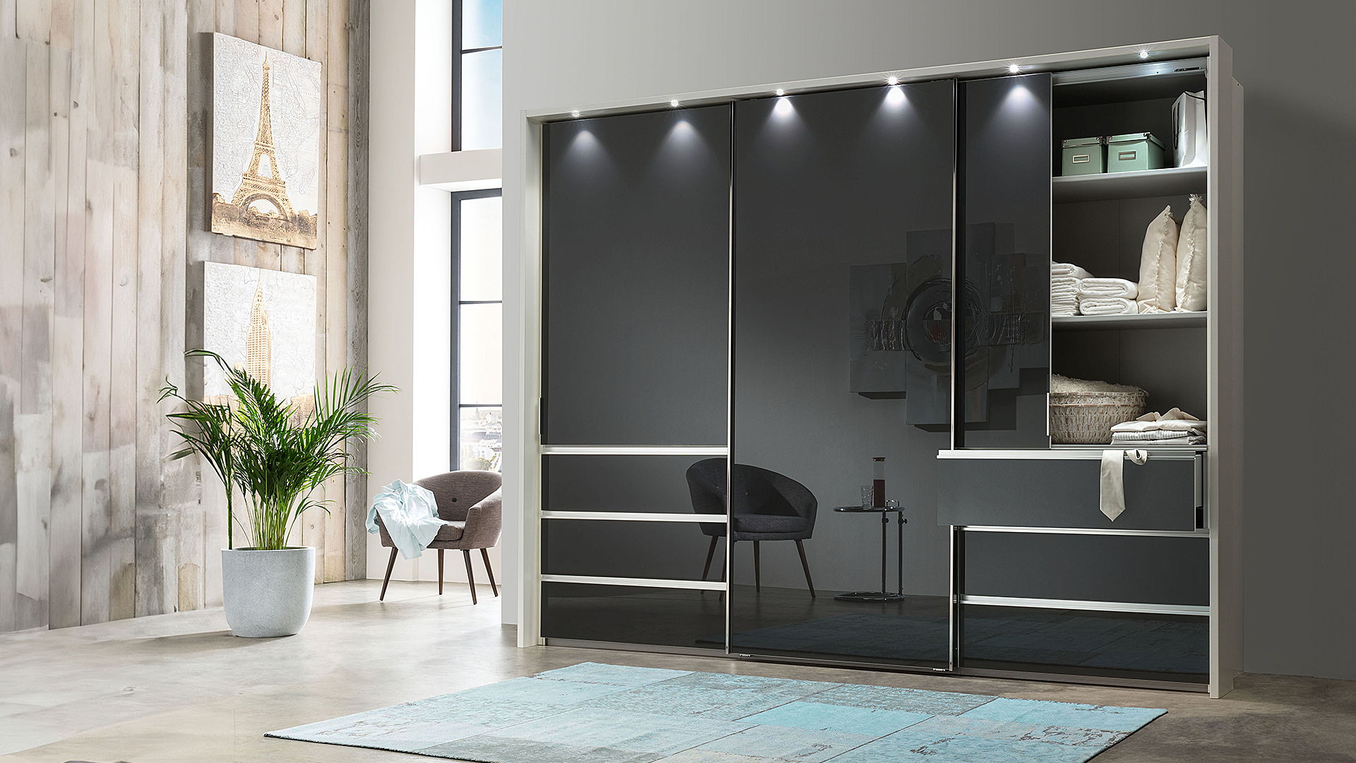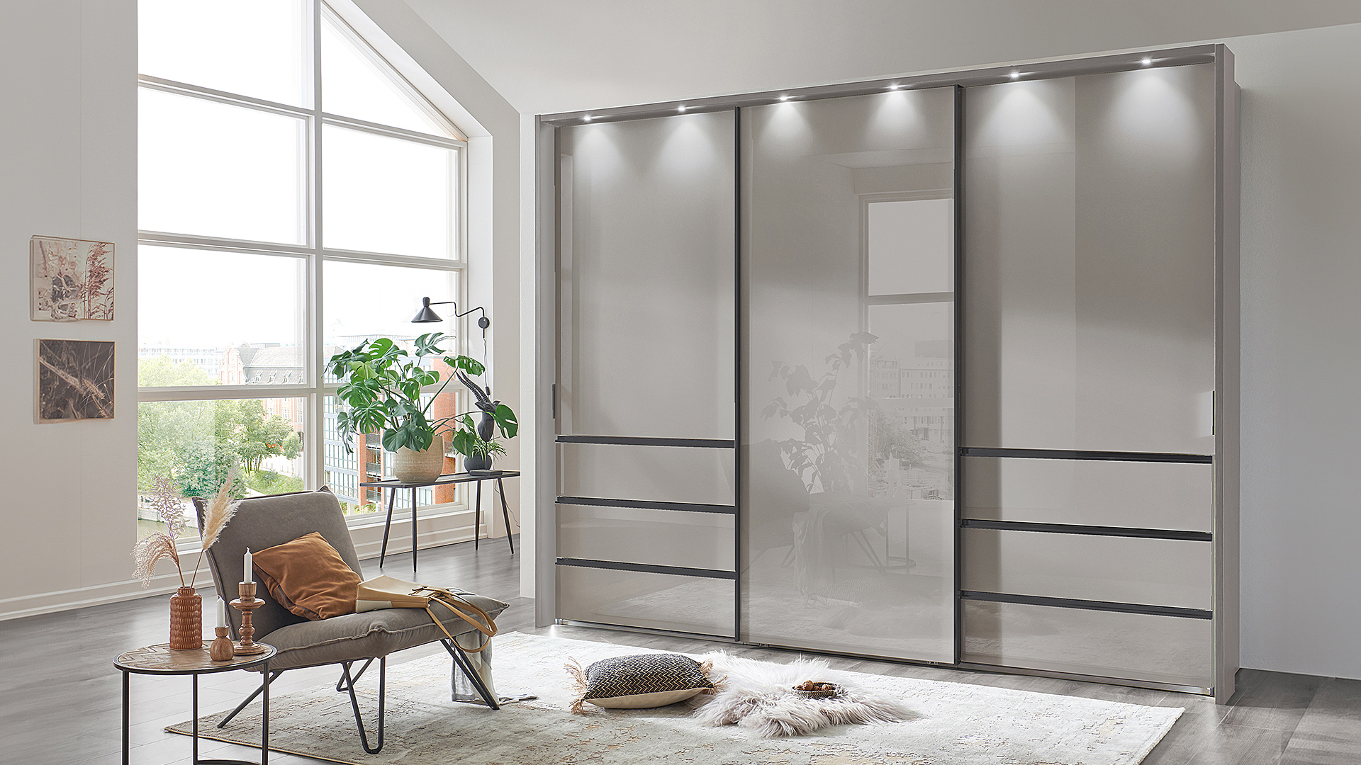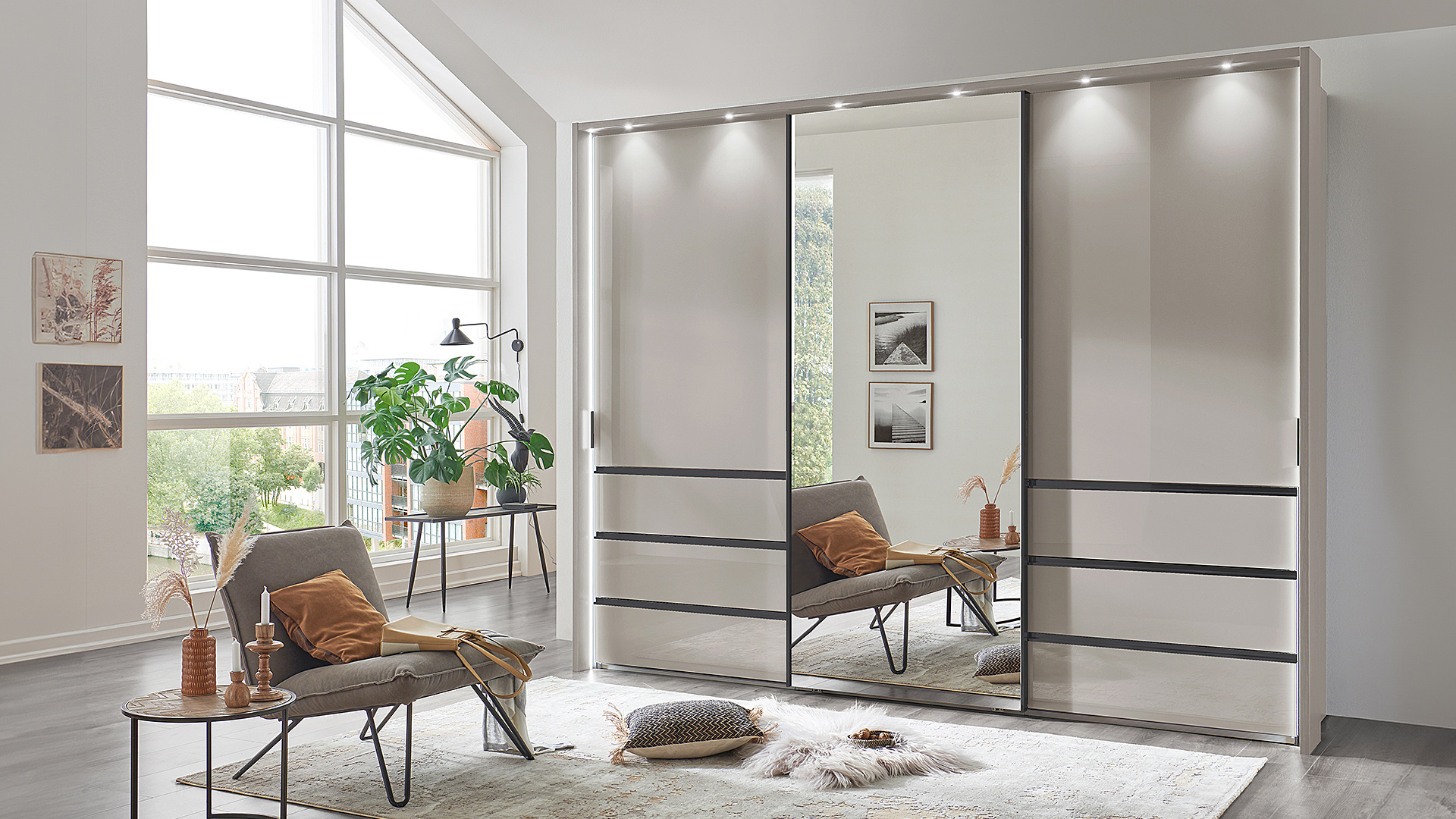 Der Schwebtürenschrank ist in drei Breiten und zwei Höhen (217 cm und 236 cm) erhältlich. Die äußeren Schubkästen mit raffinierten Mulden-Griffleisten bieten ausreichend Stauraum für Kleinigkeiten. Alternativ sind durchgängig bodenlange Türen verfügbar. Für ein aufgeräumtes Schrankinnenleben sorgt unsere umfangreiche Innenausstattung. Ein Passepartout-Rahmen, mit oder ohne Beleuchtung, und weitere Beleuchtungsmöglichkeiten vervollständigen das Bild Ihres neuen Schrankes!