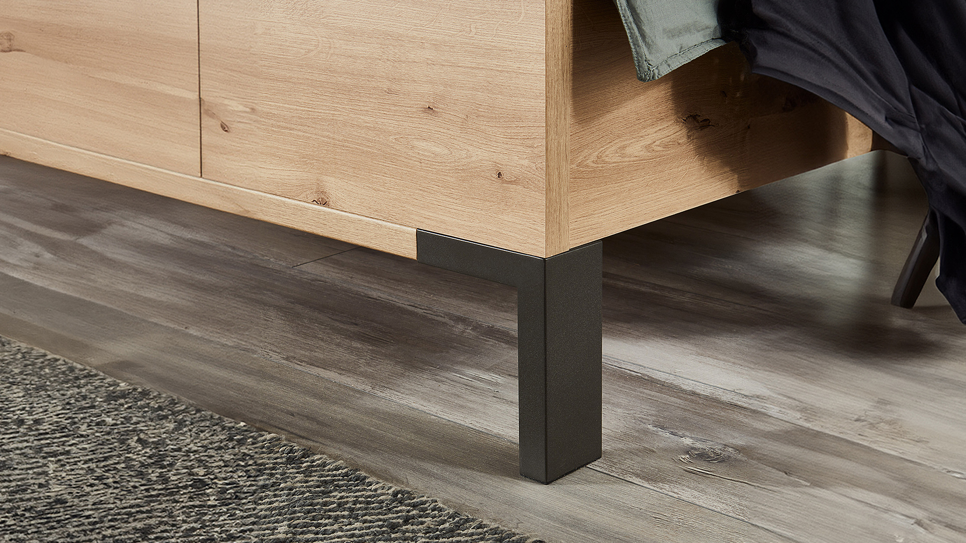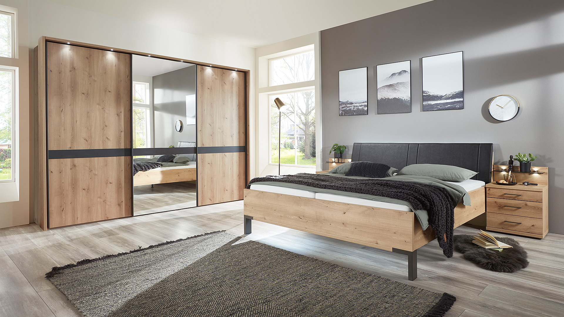 Machen Sie es sich in Ihrem neuen Bett aus dem Schlafraummöbel-Programm MEXIKO gemütlich. Dieses Modell überzeugt mit seiner Kombination aus Holzcharakter und modernen schieferfarbenen Akzenten, die sich in den Griffleisten, Griffen und Bettfüßen wiederfinden. Das Design ist schlicht und somit zeitlos, sodass Sie auch in vielen Jahren noch Freude am Anblick Ihres Schlafzimmers haben werden.
