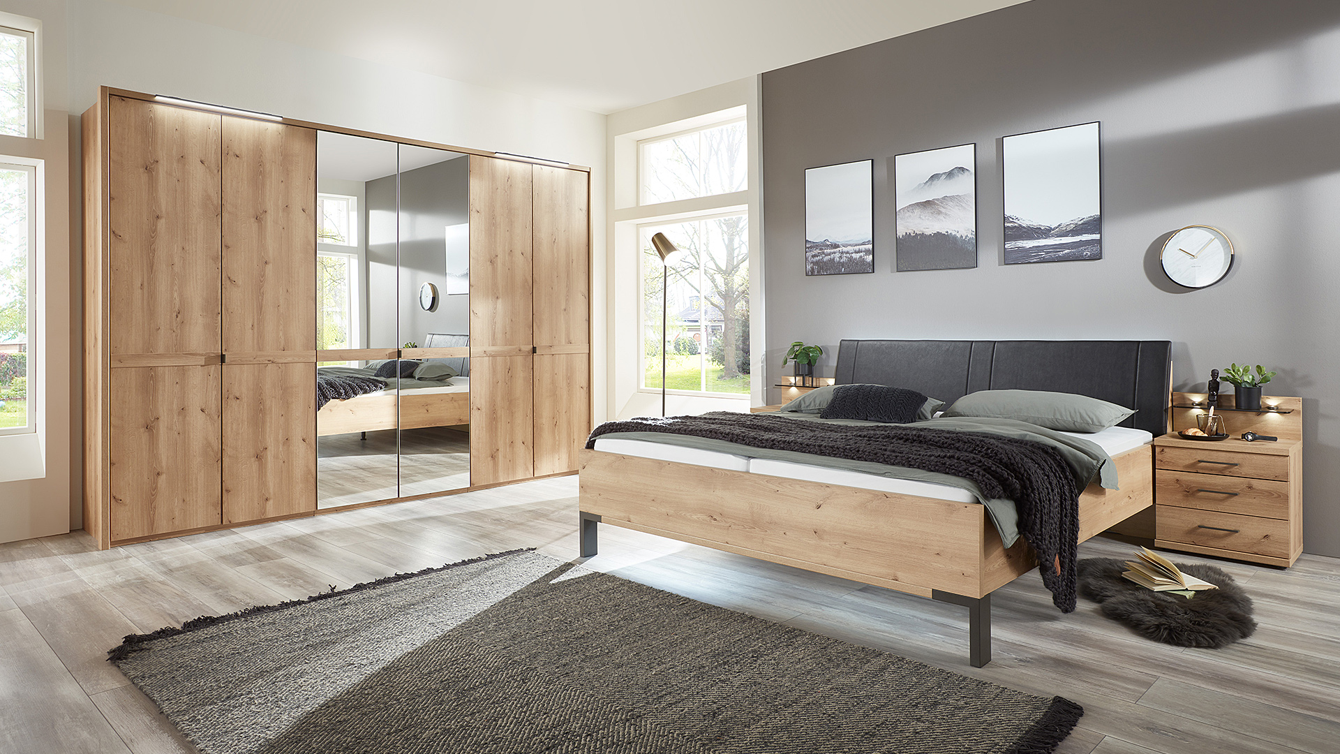 Bei den Betten sorgt die energiesparende LED-Ambiente-Beleuchtung für ein stimmungsvolles Licht hinter dem Kopfteil. Lesen Sie abends im Bett noch ein gutes Buch – dabei können Sie sich an das bequeme Polster-Kopfteil in Kunstleder anthrazit oder Champagner anlehnen und die LED-Flexleuchte in schiefer einschalten, die ausreichend Licht ins Dunkel bringt. Ausreichend Stauraum bietet der formschöne Großraum-Bettschubkasten, in dem sich beispielsweise Decken oder Kissen hervorragend verstauen lassen.