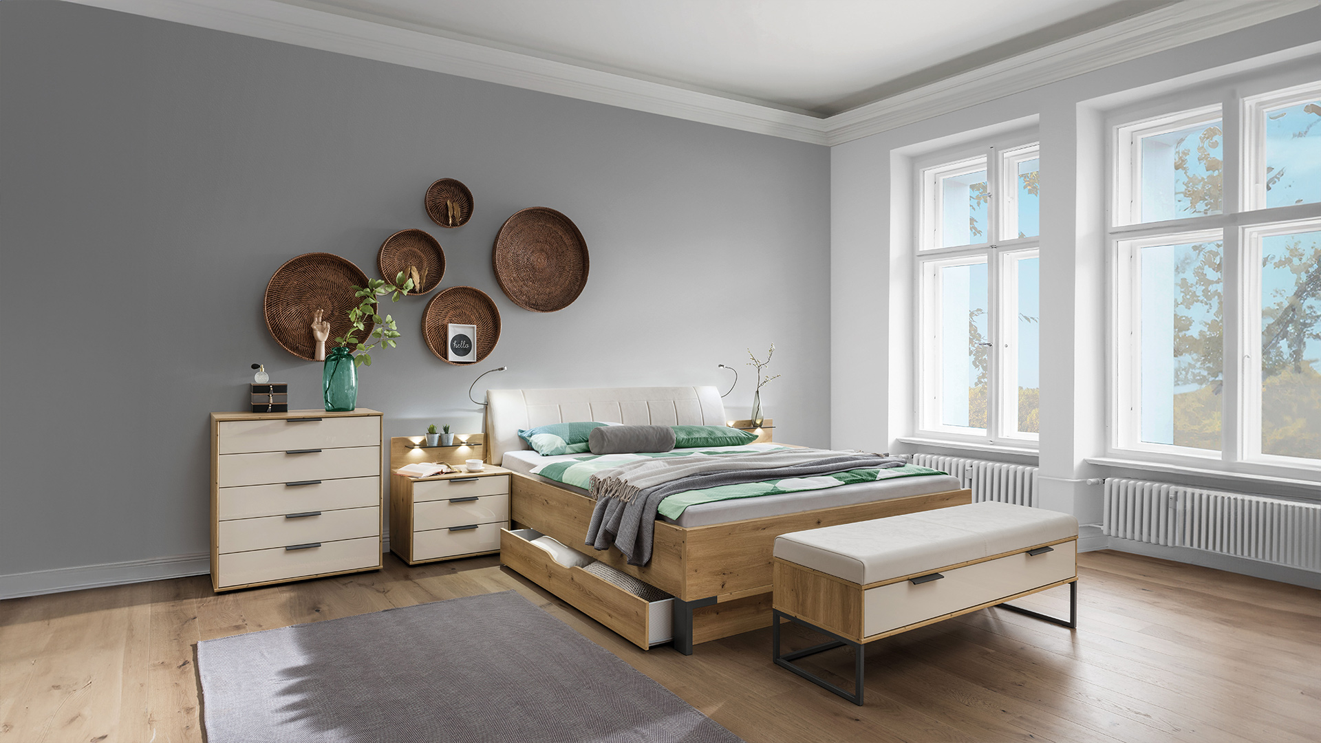 Vervollständigen Sie Ihren modernen Schlafbereich mit einem bequemen Futonbett der Serie MONACO samt gepolstertem Kunstleder-Kopfteil in den Farbnuancen Weiß, Champagner, Graphit oder Kieselgrau. Passen Sie Ihre komfortable Ruheinsel mithilfe der vierfachen Liegehöhen-Verstellung Ihrer individuellen Schlafposition an oder relaxen Sie an Ihrem neuen Lieblingsplatz bei einem guten Buch oder Milchkaffee. Die Futonbetten der Serie MONACO lassen sich dank verschiedener Breiten in eine großzügige Liegefläche verwandeln und mit nützlichen Zusatzelementen wie einer LED-Ambiente-Beleuchtung oder einer LED-Bügelleuchte ausstatten. Passend dazu bieten Ihnen die Nachtkonsolen im Korpus-Farbton oder mit Glasfront eine großzügige Ablagemöglichkeit, während die entsprechenden Beimöbel wie Kommoden, Ankleidebänke oder Hängespiegel Ihr Schlafzimmer komplettieren.