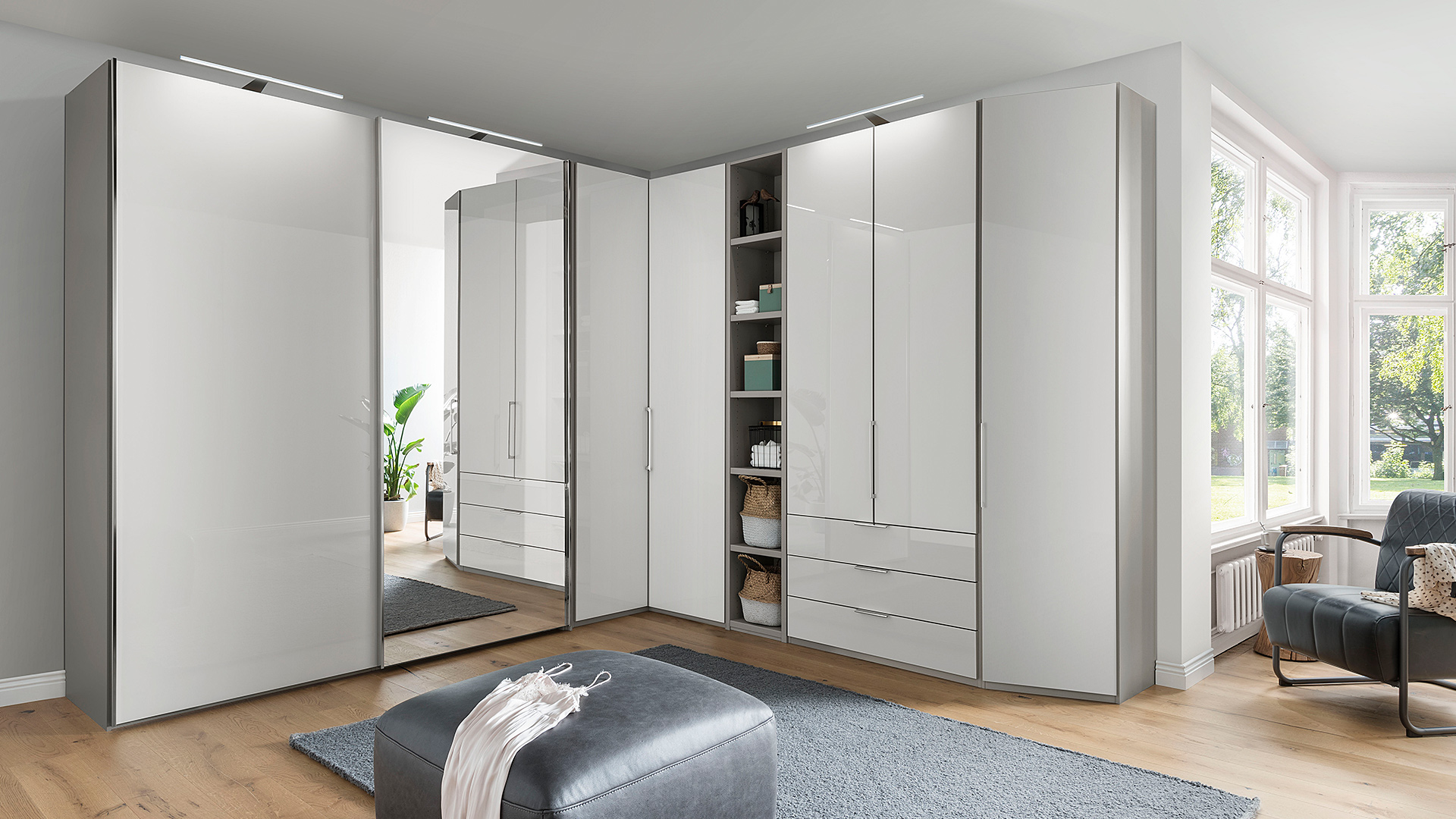 Das funktionale Schranksystem der Serie MONACO punktet mit frei zusammenstellbaren Korpus- und Frontausführungen. Entscheiden Sie sich für ein facettenreiches Dekor in Weiß, Champagner, Graphit, Kieselgrau oder Bianco-Eiche-Nachbildung, kombiniert mit Griffen in Chrom, Silber und Schiefer oder wählen Sie die Ausführung einer farbigen Glasfront, inklusive Kristallspiegel und einem harmonierenden Innenfarbton. Ob Drehtürenschränke, Falttürenschränke, voll ausgebaute Eckschränke mit zusätzlicher Kranzleiste, Abschlussschränke mit Drehtür oder passende Regalelemente - der Einrichtungsvielfalt sind mit der Möbelserie MONACO keine Grenzen gesetzt. Je nach Modell mit wechselseitig wählbaren Türanschlägen, mehrteiligen Auszügen und exklusivem Schrankzubehör versehen, weisen die Schrankelemente mit zwei Einlegeböden und einer Kleiderstange je Fach eine clevere Inneneinteilung auf.