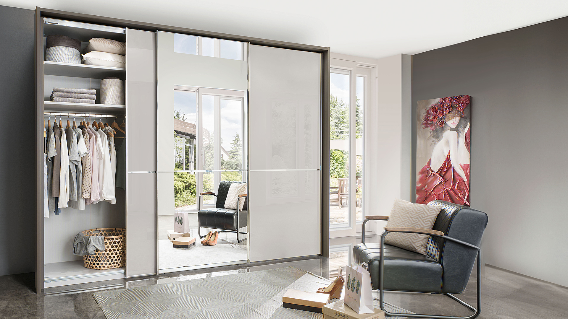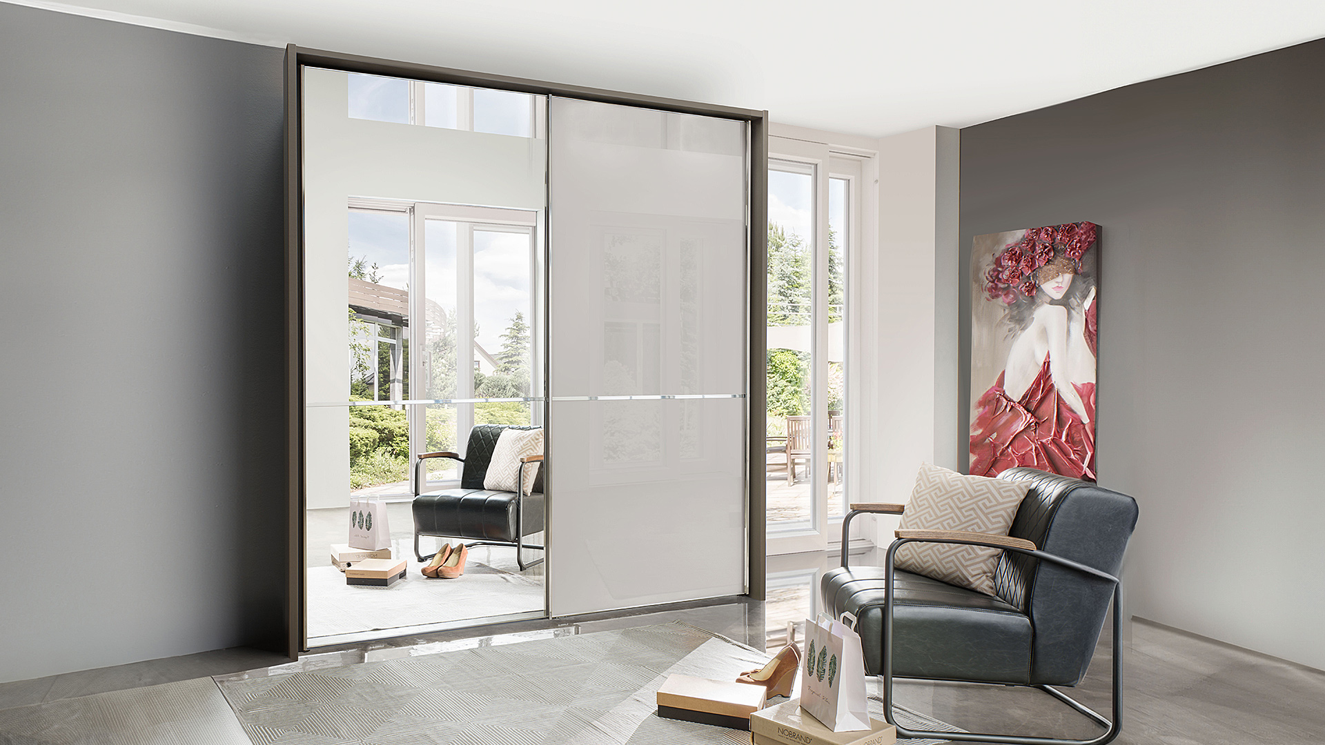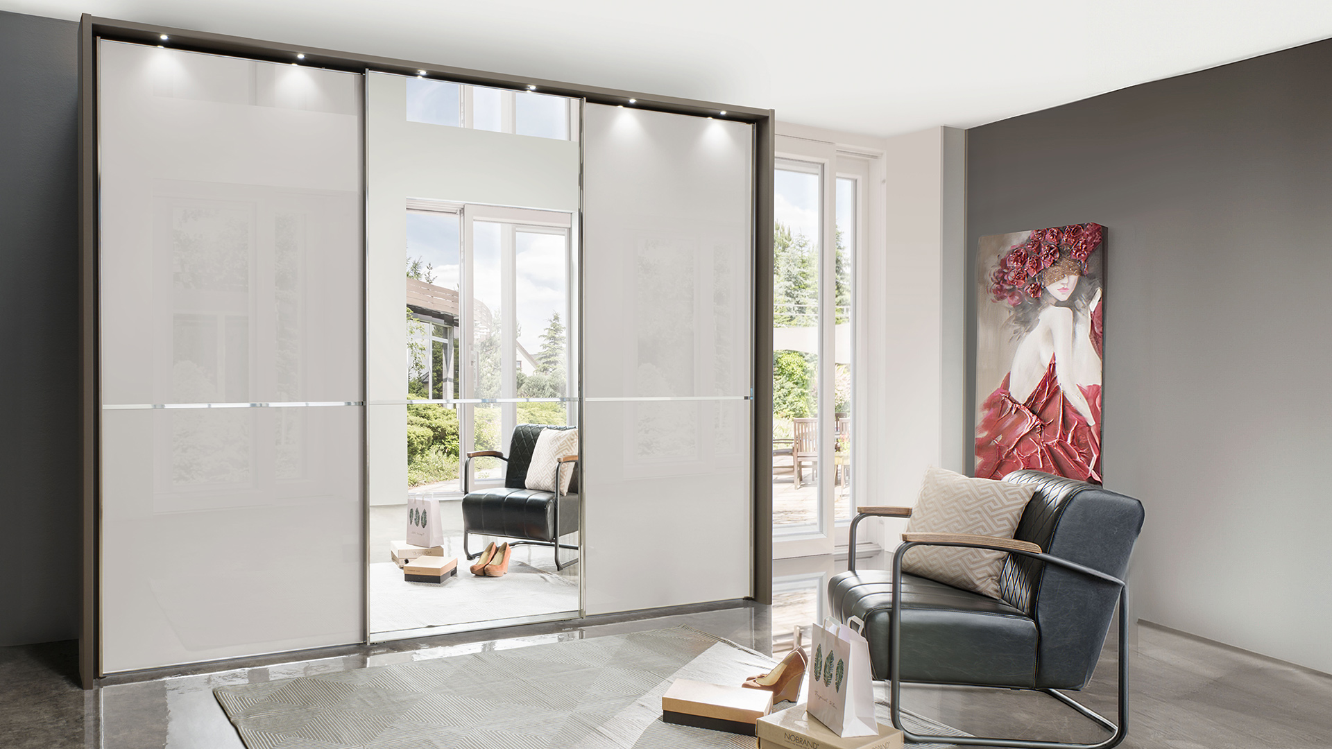 Unzählige Varianten an Drehtürenschränken, Funktionsschränken und Schwebetürenschränken mit Glas- Fronten und Spiegeltüren warten auf Sie. Für eine komplette Hochglanzoptik lassen sich auch die Seitenwände mit Glas-Auflagen verkleiden. Die Korpuselemente in 50 cm und 100 cm Breite sind beliebig erweiterbar bis zu einer Breite von 400 cm und mehr.