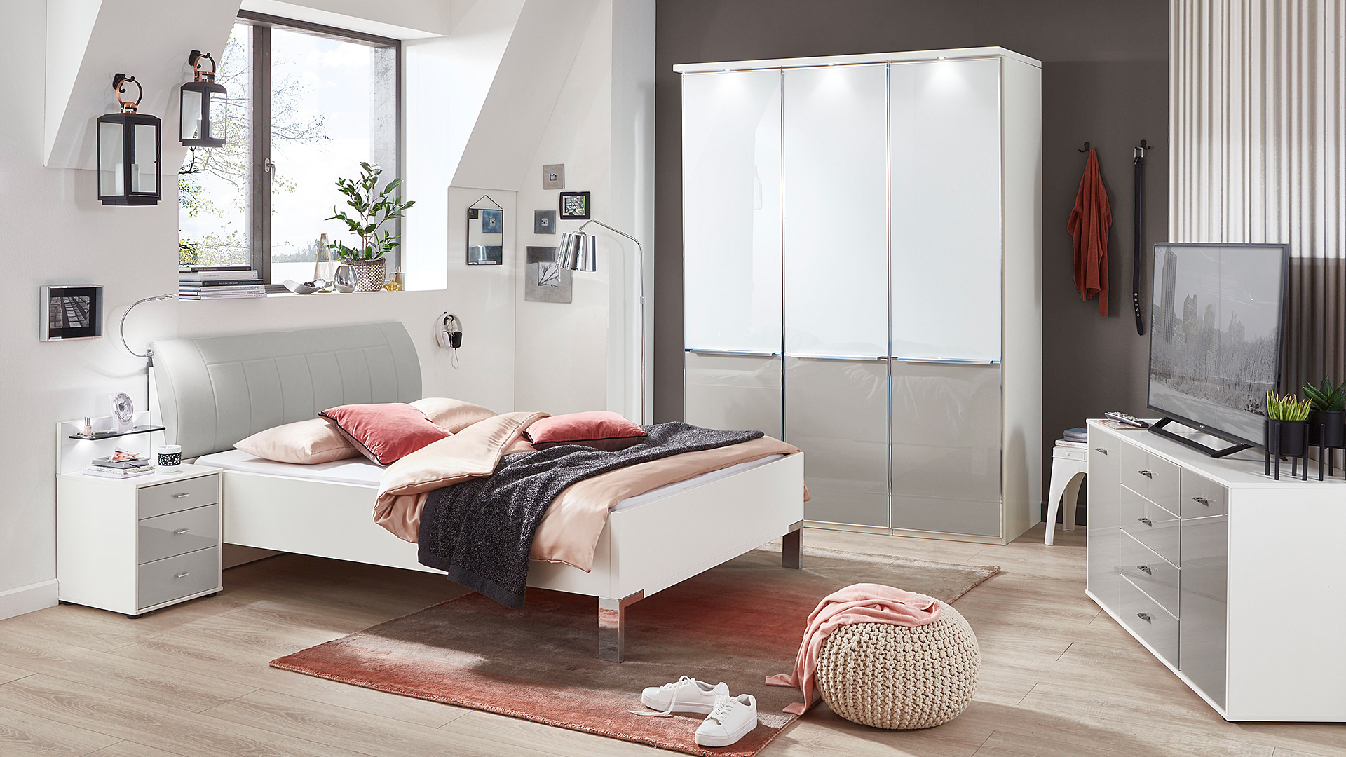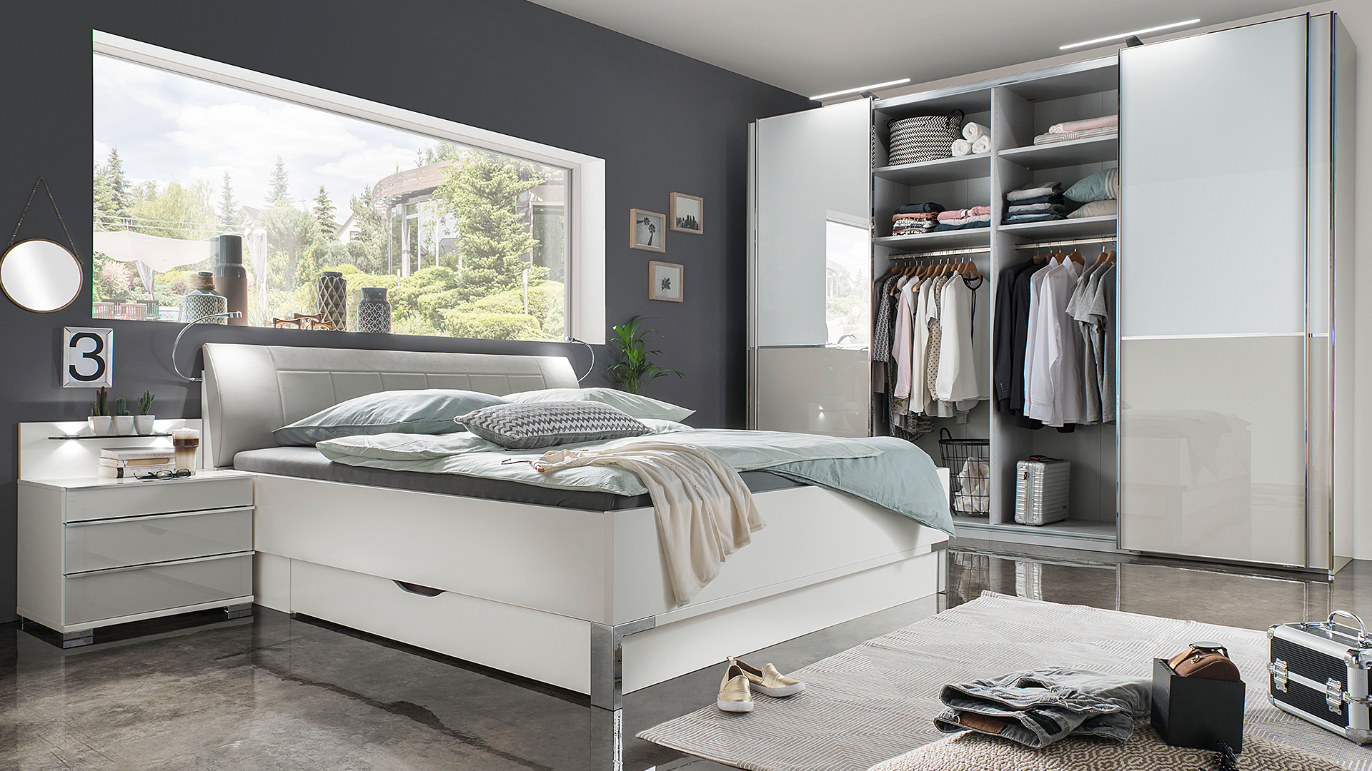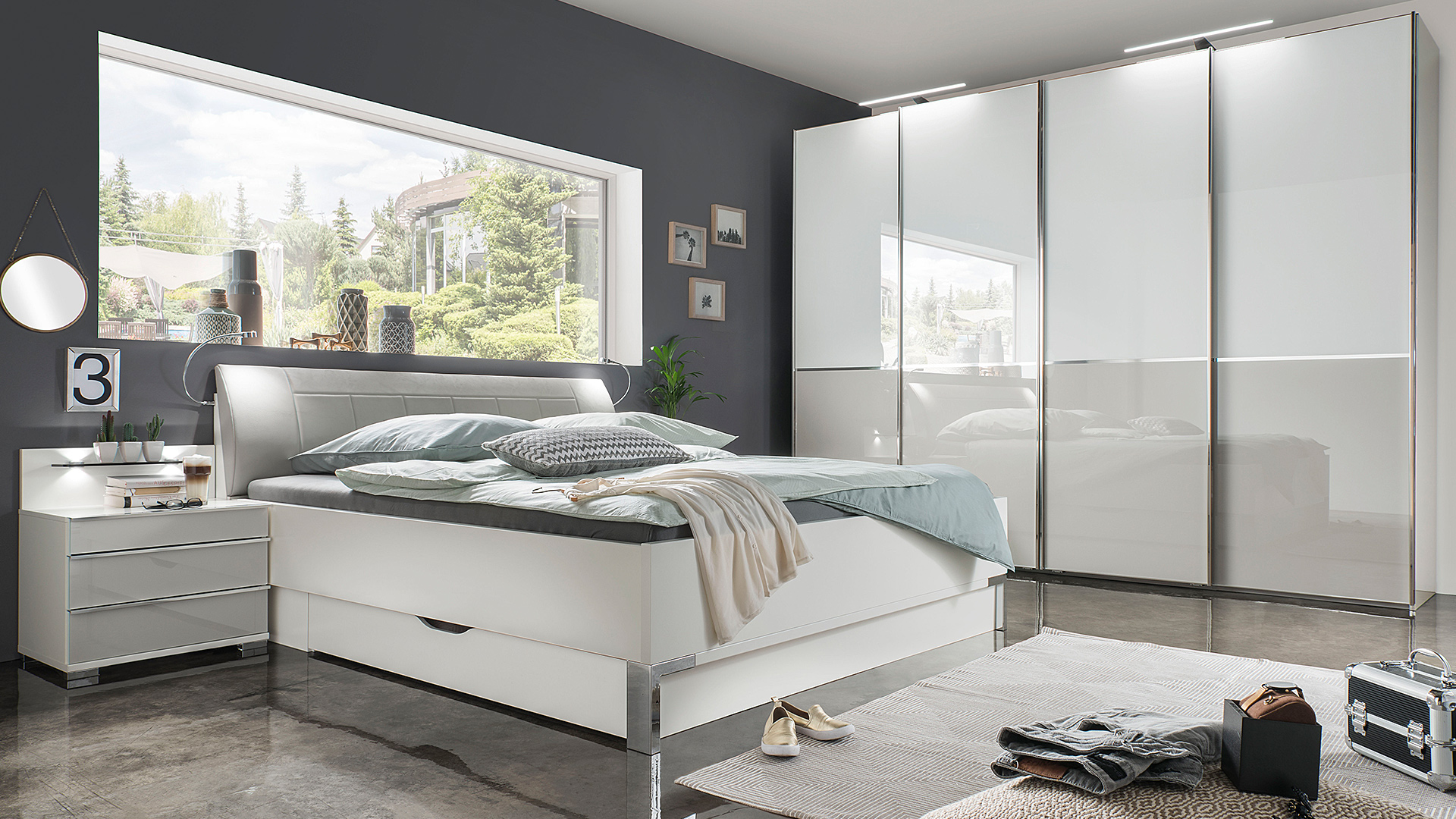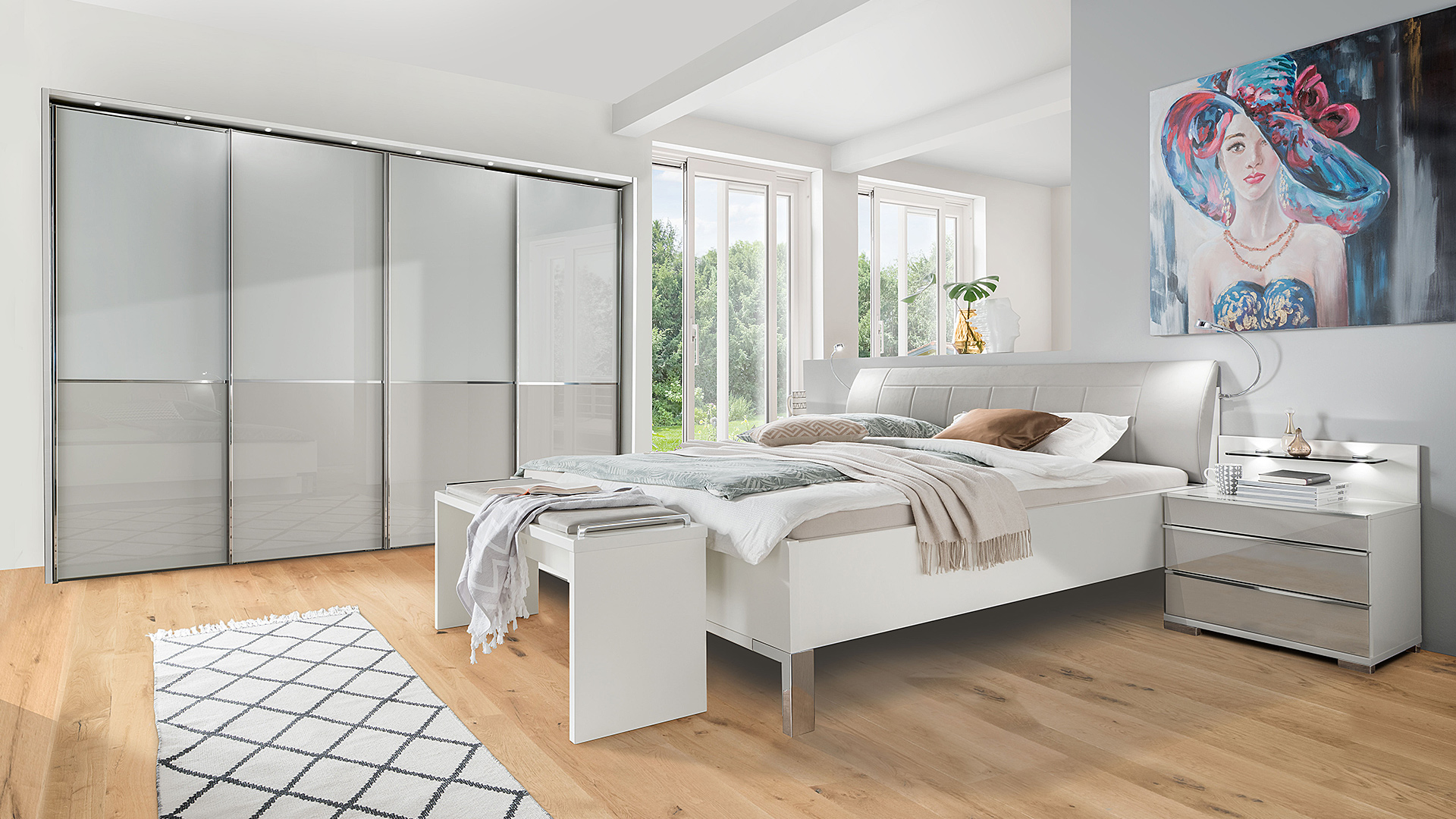 Unzählige Varianten an Drehtürenschränken, Funktionsschränken und Schwebetürenschränken mit Glas- Fronten und Spiegeltüren warten auf Sie. Für eine komplette Hochglanzoptik lassen sich auch die Seitenwände mit Glas-Auflagen verkleiden. Die Korpuselemente in 50 cm und 100 cm Breite sind beliebig erweiterbar bis zu einer Breite von 400 cm und mehr.