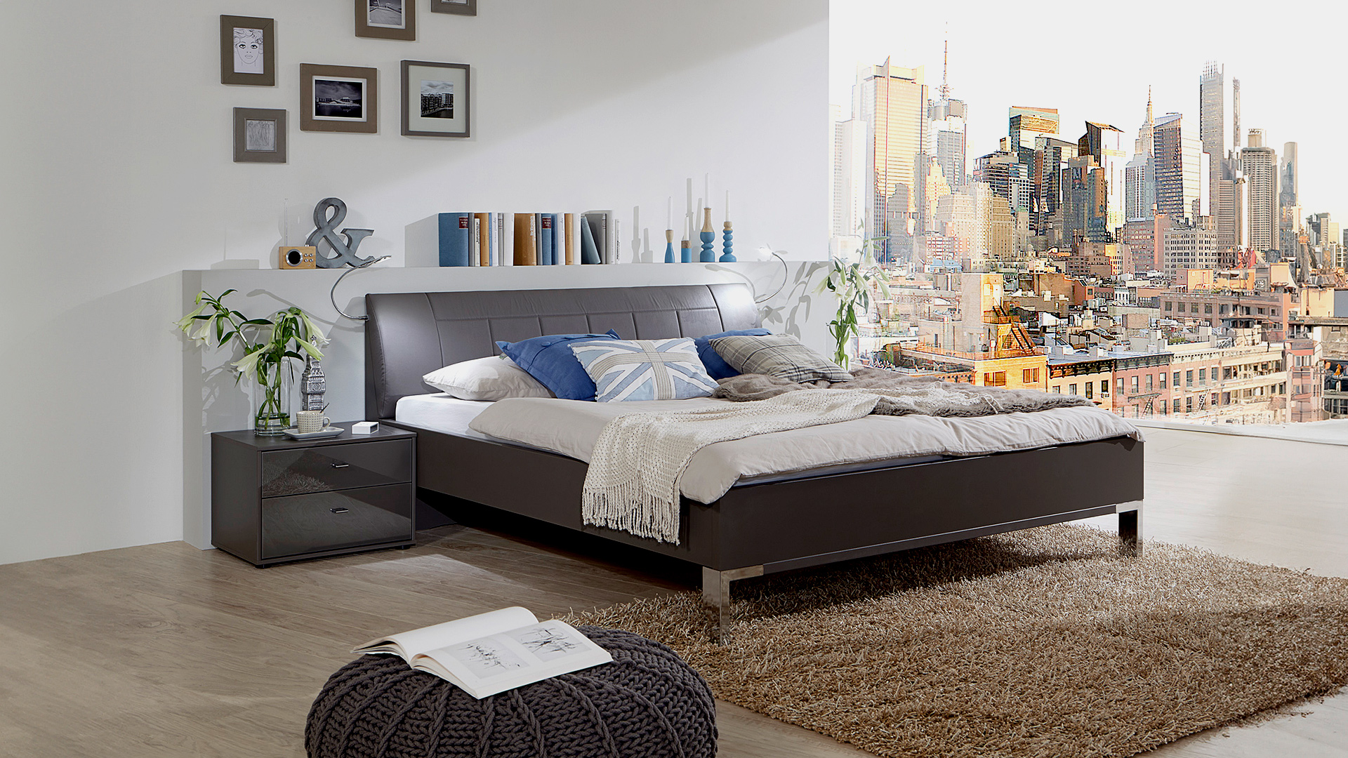 Auch ein bequemes Bett darf für einen erholsamen Schlaf auf keinen Fall fehlen! Dieses ist in je drei verschiedenen Länge und Breiten erhältlich, jeweils mit einem Polster-Kopfteil in einer von fünf vorhandenen Kunstleder-Farben.