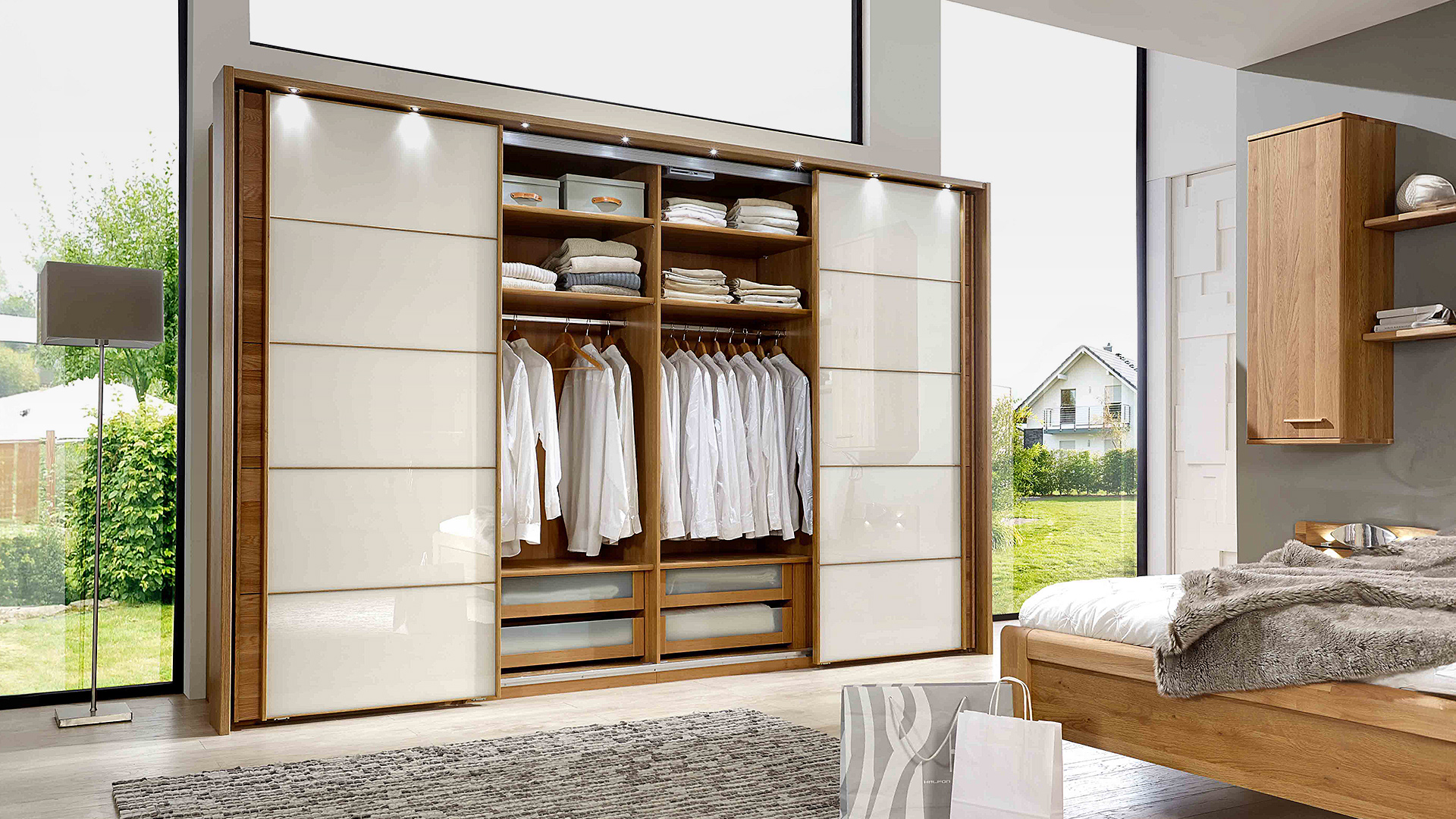 Die Drehtürenschränke, Funktionsschränke und Schwebetürenschränke sind in diversen Breiten mit Holztüren im Korpus-Farbton oder mit Auflagen aus farbigem Glas oder Spiegelglas lieferbar. Für eine optimale Raumnutzung bietet sich eine Erweiterung der Schränke als Ecklösung mit Eckschrank an.