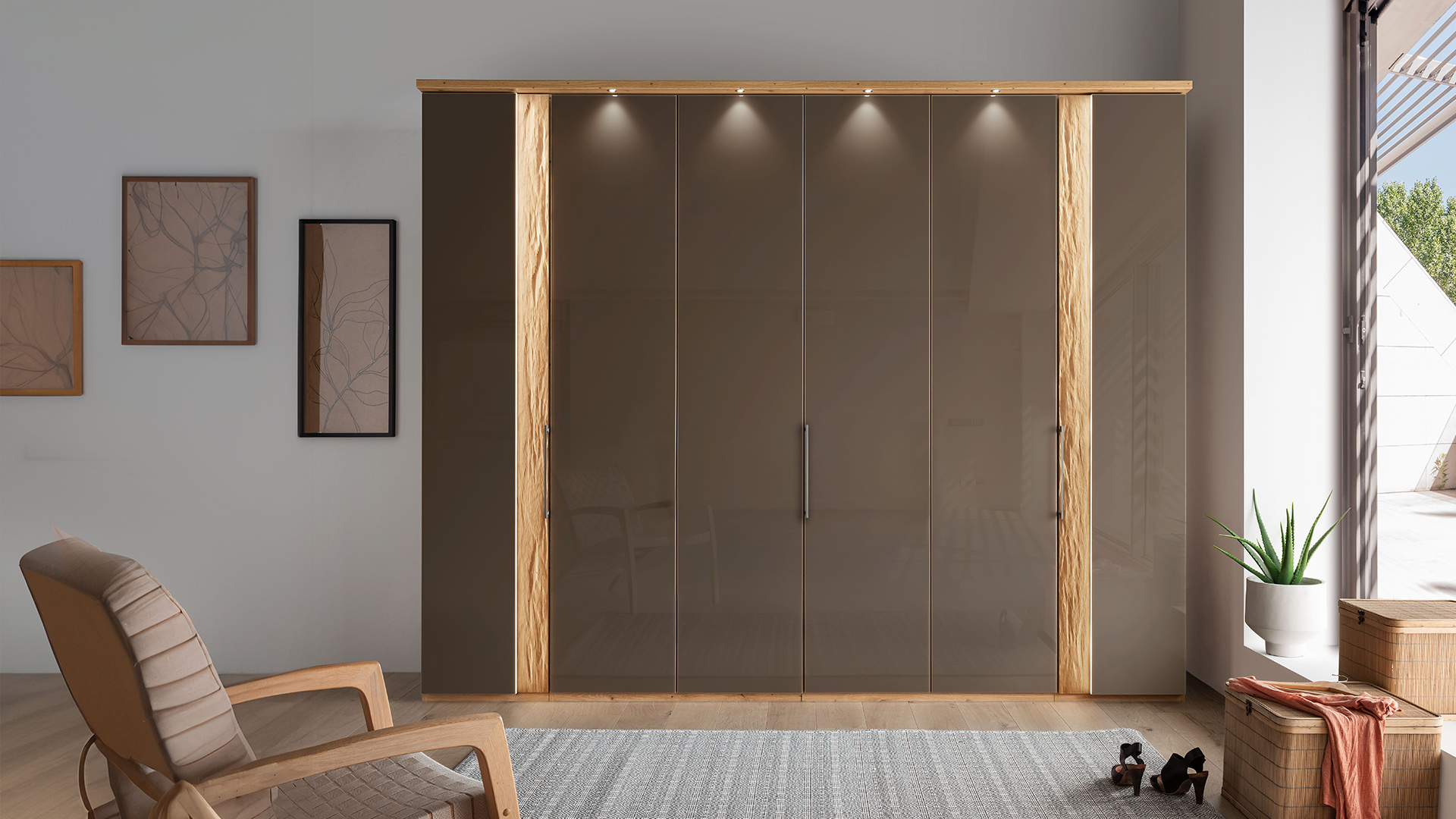 Die Drehtürenschränke der VANCOUVER-Serie sind nicht nur funktional, sondern auch ein echter Blickfang. Sie sind in Breiten von 50 cm bis 400 cm erhältlich und bieten eine Vielzahl an Kombinationsmöglichkeiten. Besonderes Augenmerk gilt den hochwertigen teilmassiven Elementen und den stilvollen Designaußentüren, die dieses Programm einzigartig machen. Die Designaußentüren mit Aufleistungen in Riffholz massiv schaffen eine natürliche, lebendige Optik. Diese Außentüren können mit Glastüren kombiniert werden, was den Schränken eine edle und zugleich moderne Ausstrahlung verleiht.