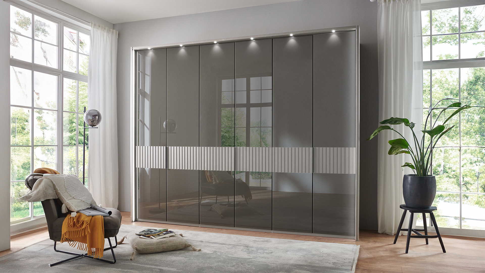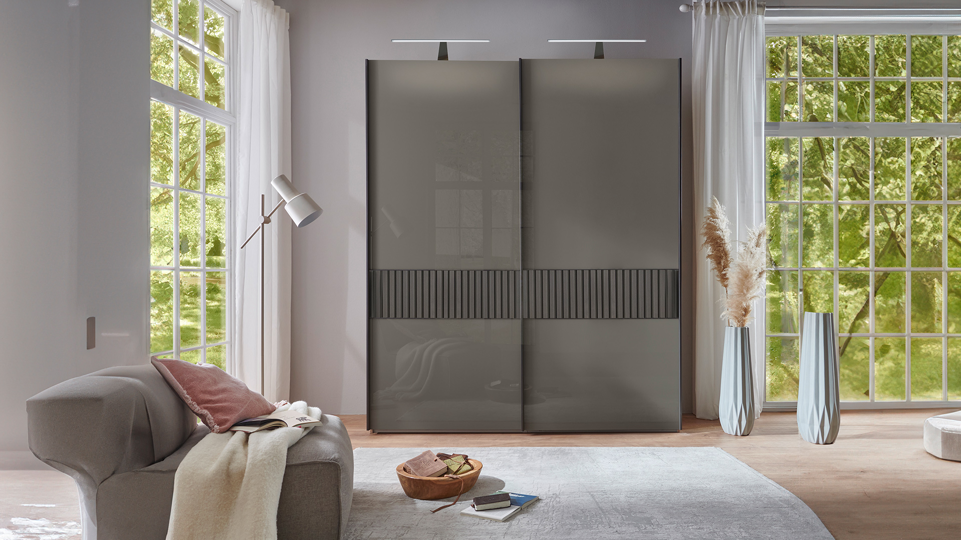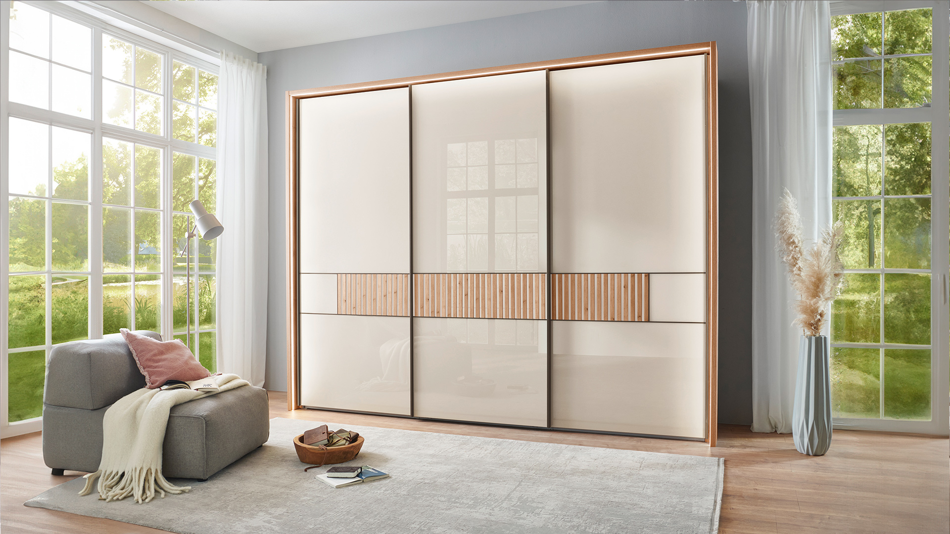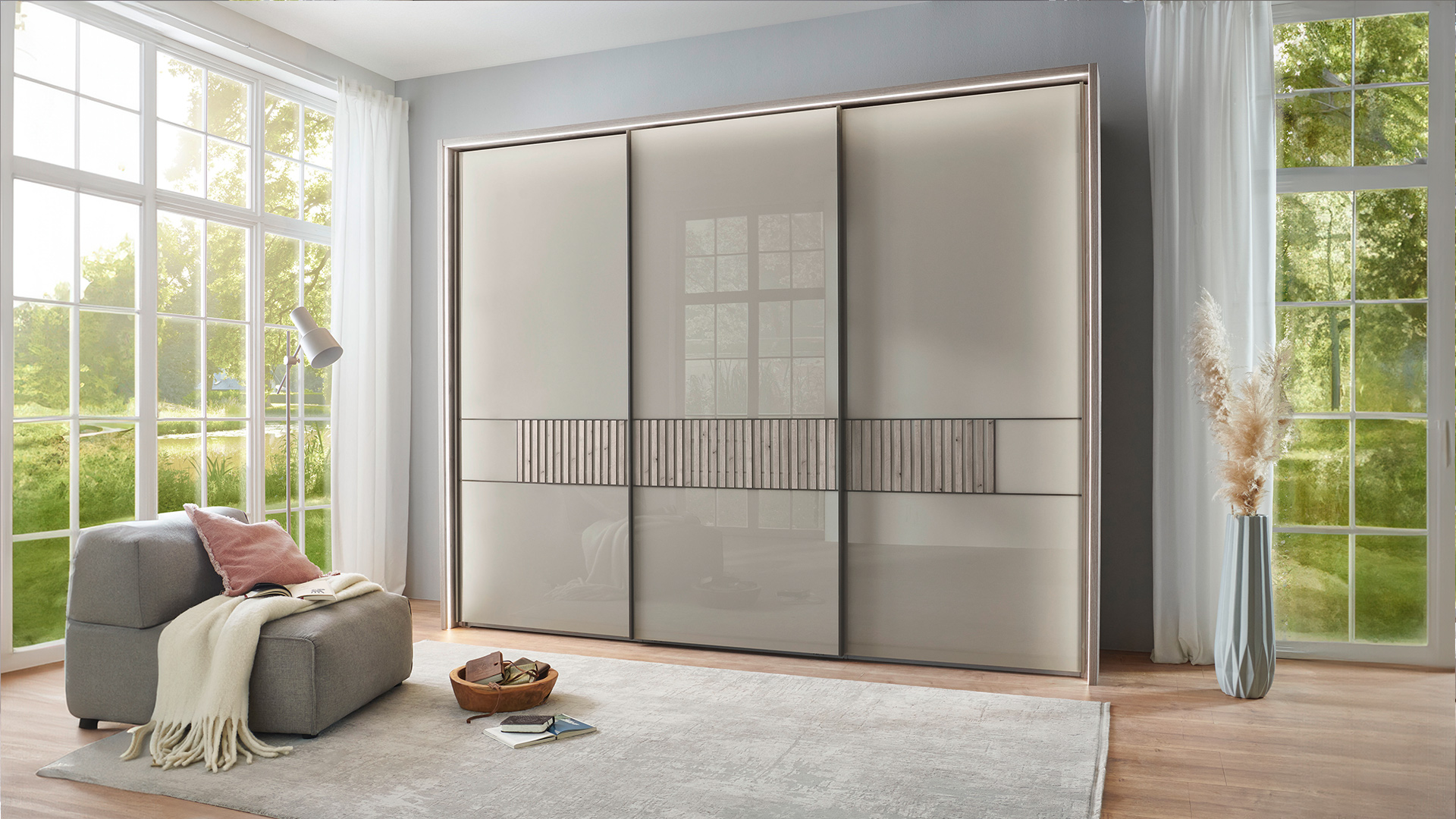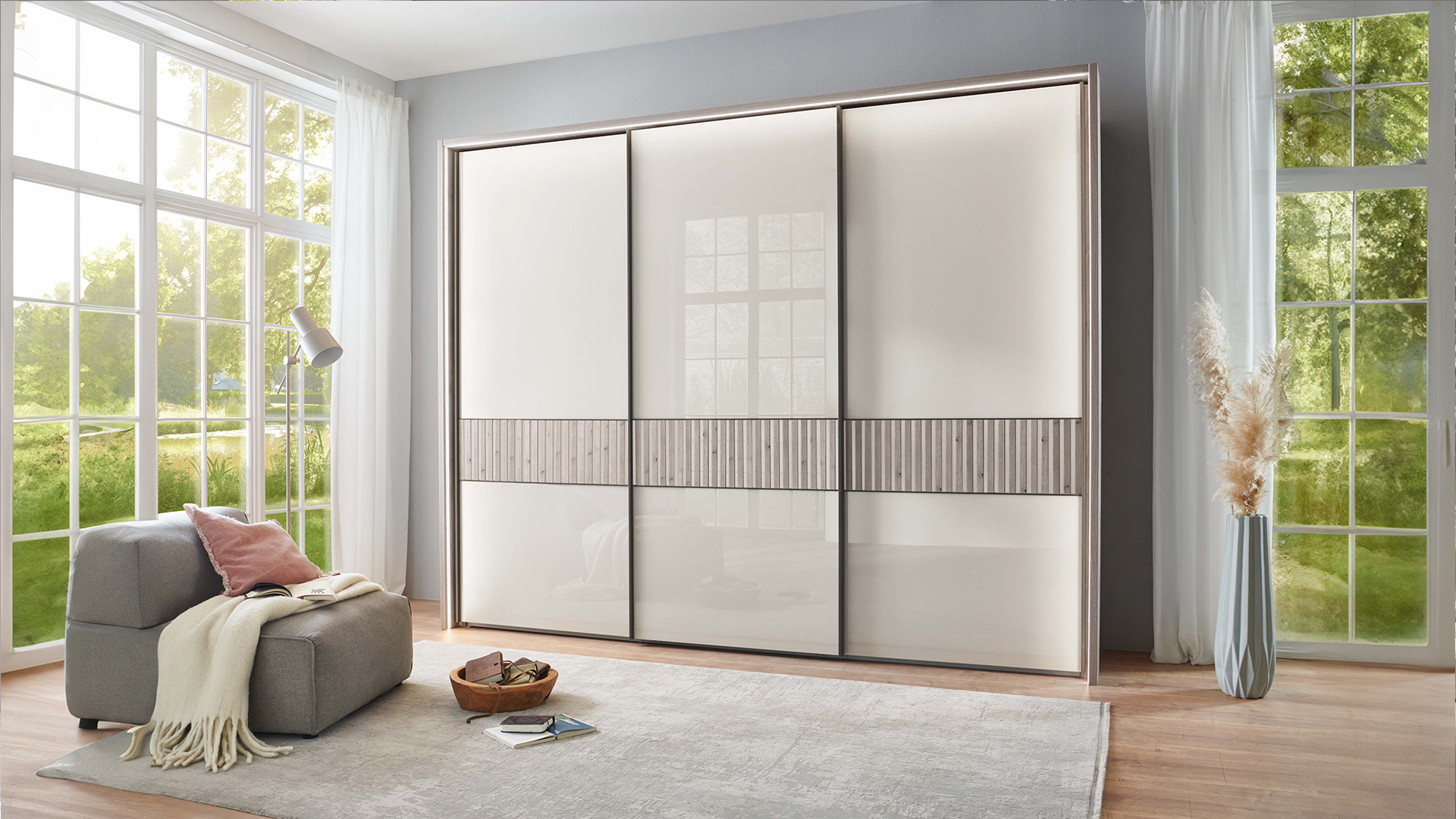 Die Schwebetürenschränke bieten eine elegante Alternative zu den Drehtürenschränken. Sie sind in mehreren Breiten erhältlich und verfügen bei der 4-türigen Version über eine komfortable Synchronöffnung, die das Öffnen und Schließen der Türen besonders leicht macht. Auch hier können Sie zwischen Glasfronten in den Farben Weiß, Champagner, Kieselgrau und Havanna wählen, die durch eingerückte Querriegel mit Lamellen im Korpus-Farbton abgerundet werden.