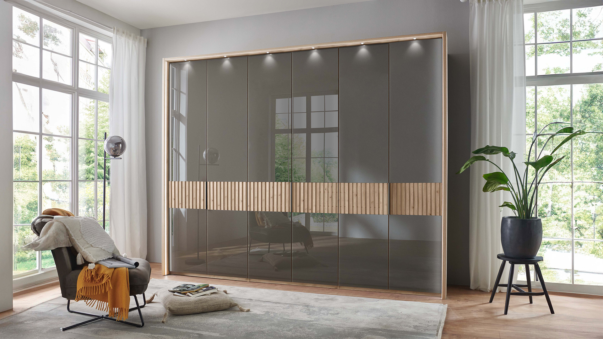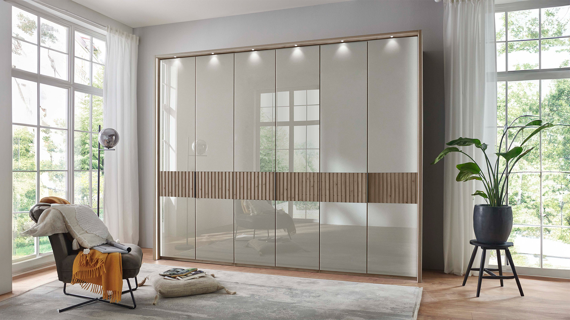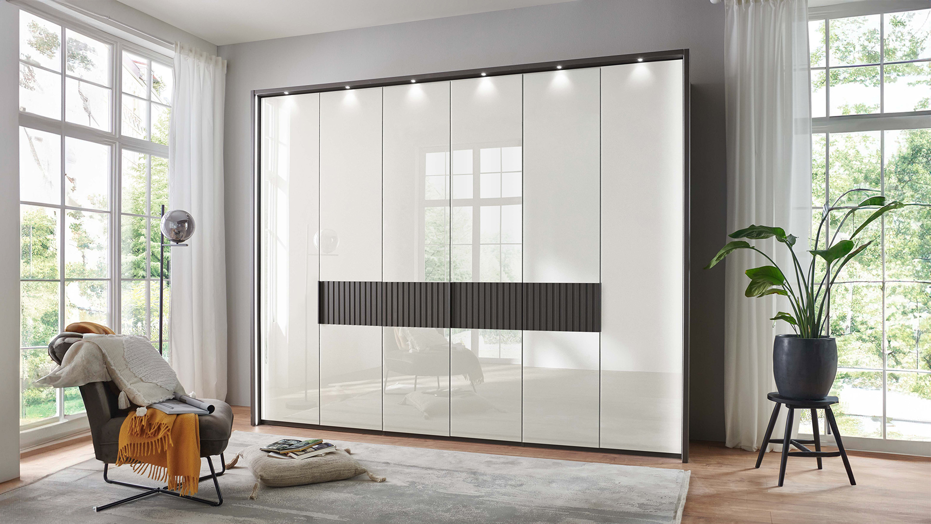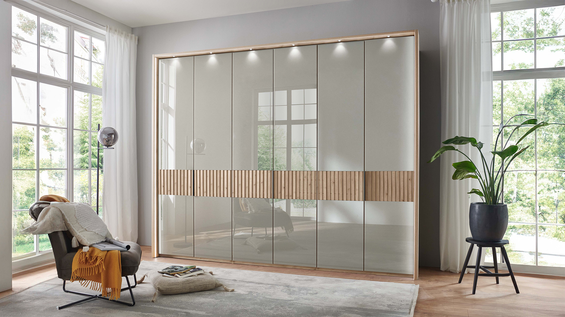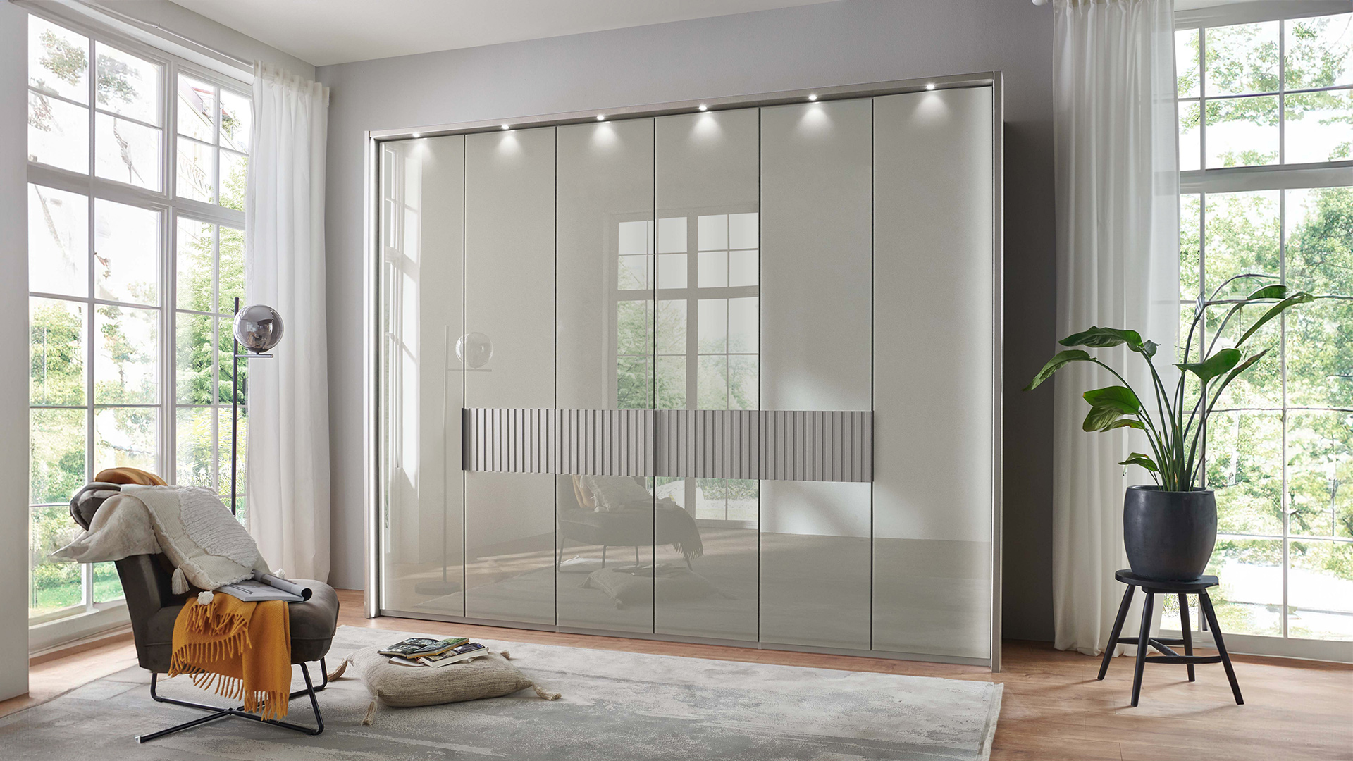 Die Schwebetürenschränke bieten eine elegante Alternative zu den Drehtürenschränken. Sie sind in mehreren Breiten erhältlich und verfügen bei der 4-türigen Version über eine komfortable Synchronöffnung, die das Öffnen und Schließen der Türen besonders leicht macht. Auch hier können Sie zwischen Glasfronten in den Farben Weiß, Champagner, Kieselgrau und Havanna wählen, die durch eingerückte Querriegel mit Lamellen im Korpus-Farbton abgerundet werden.