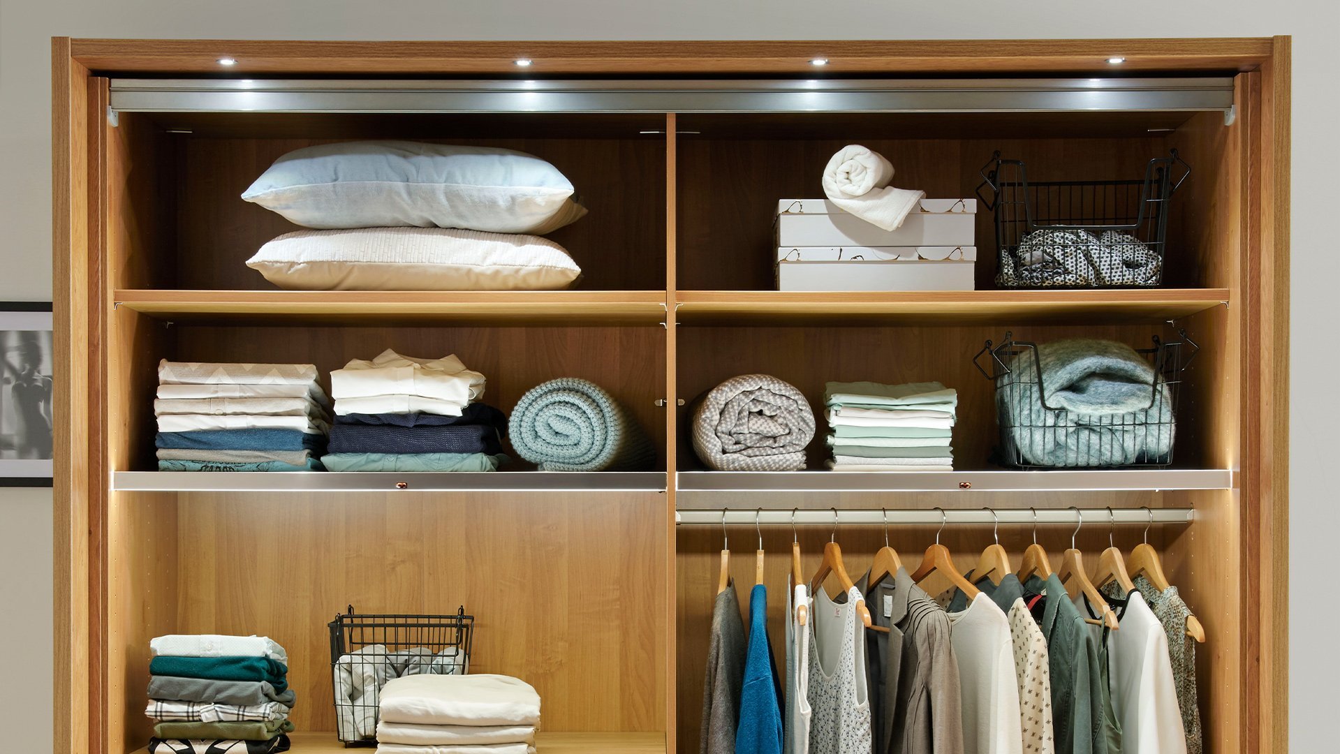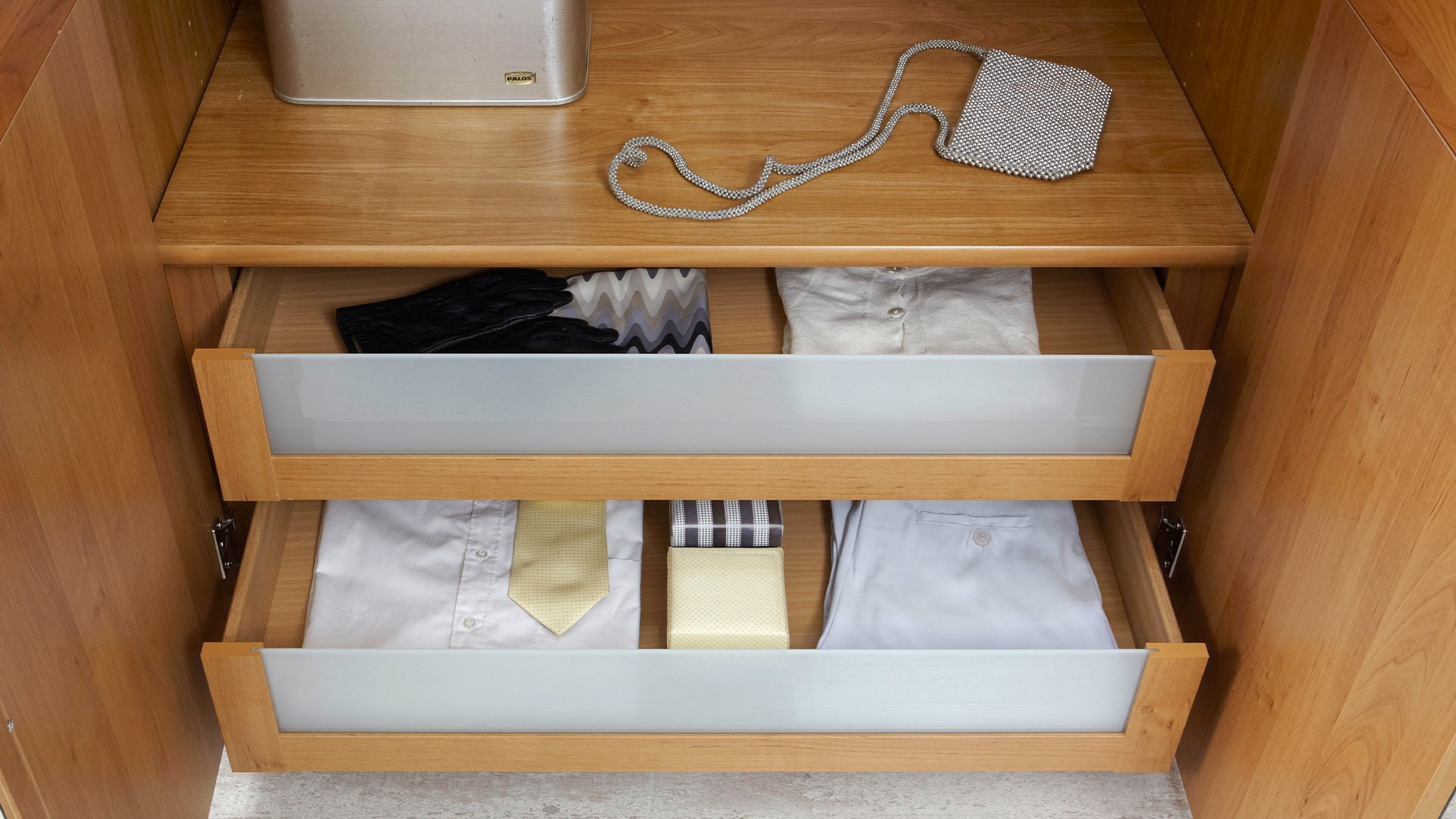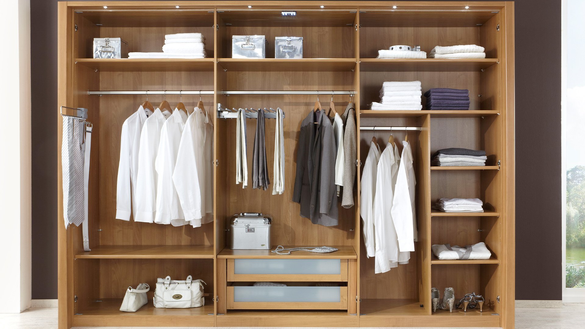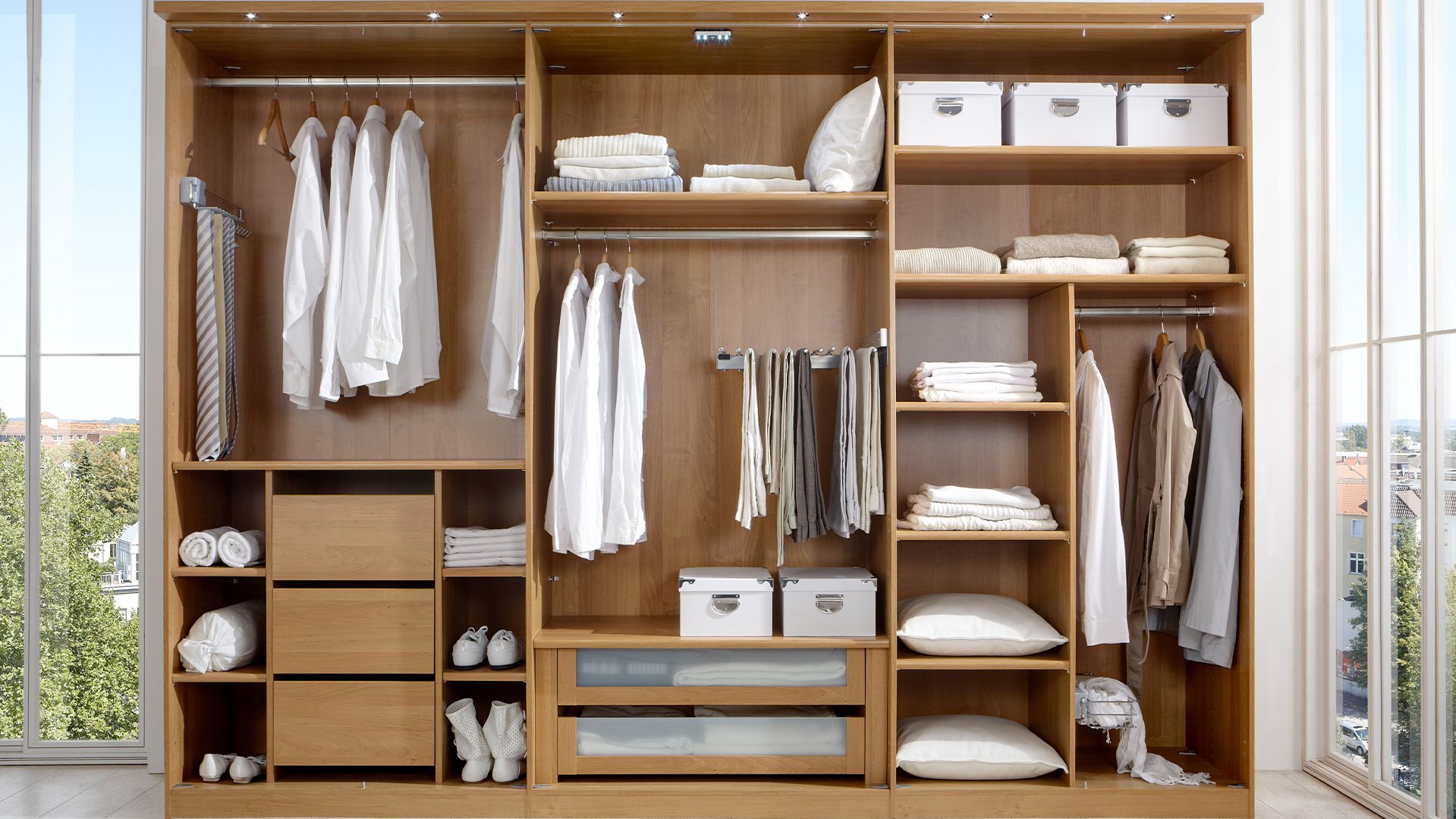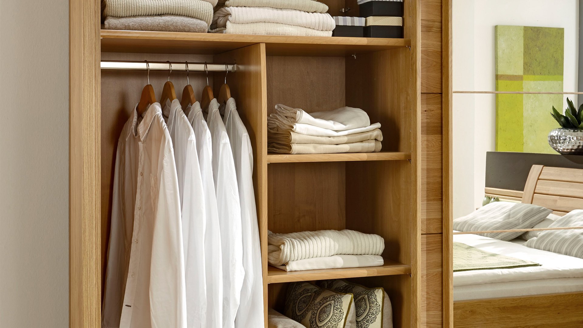 Jeder wünscht sich Ordnung in seinem Kleiderschrank. Wir helfen Ihnen, den Überblick zu behalten und bieten Ihnen zusätzliche Einlegeböden, Kleiderstangen und einen funktionalen Kleiderlift an. Socken und Wäsche lassen sich perfekt in einem unserer diversen Schubkasten-Einsätze, wahlweise mit Glas- oder Holzfront, unterbringen. Diverse Beleuchtungsmöglichkeiten setzen bewusste Lichtakzente in Ihrem Schlafzimmer. Weiteren Komfort erlangen Sie mit der USB-Steckdose, dem Krawatten- und Gürtelhalter/-auszug, dem Utensilienauszug, dem Schuhrost sowie zusätzlichen Dämpfern für Drehtüren. Als nützlich kann sich zusätzlich der platzsparende Innenspiegl erweisen.