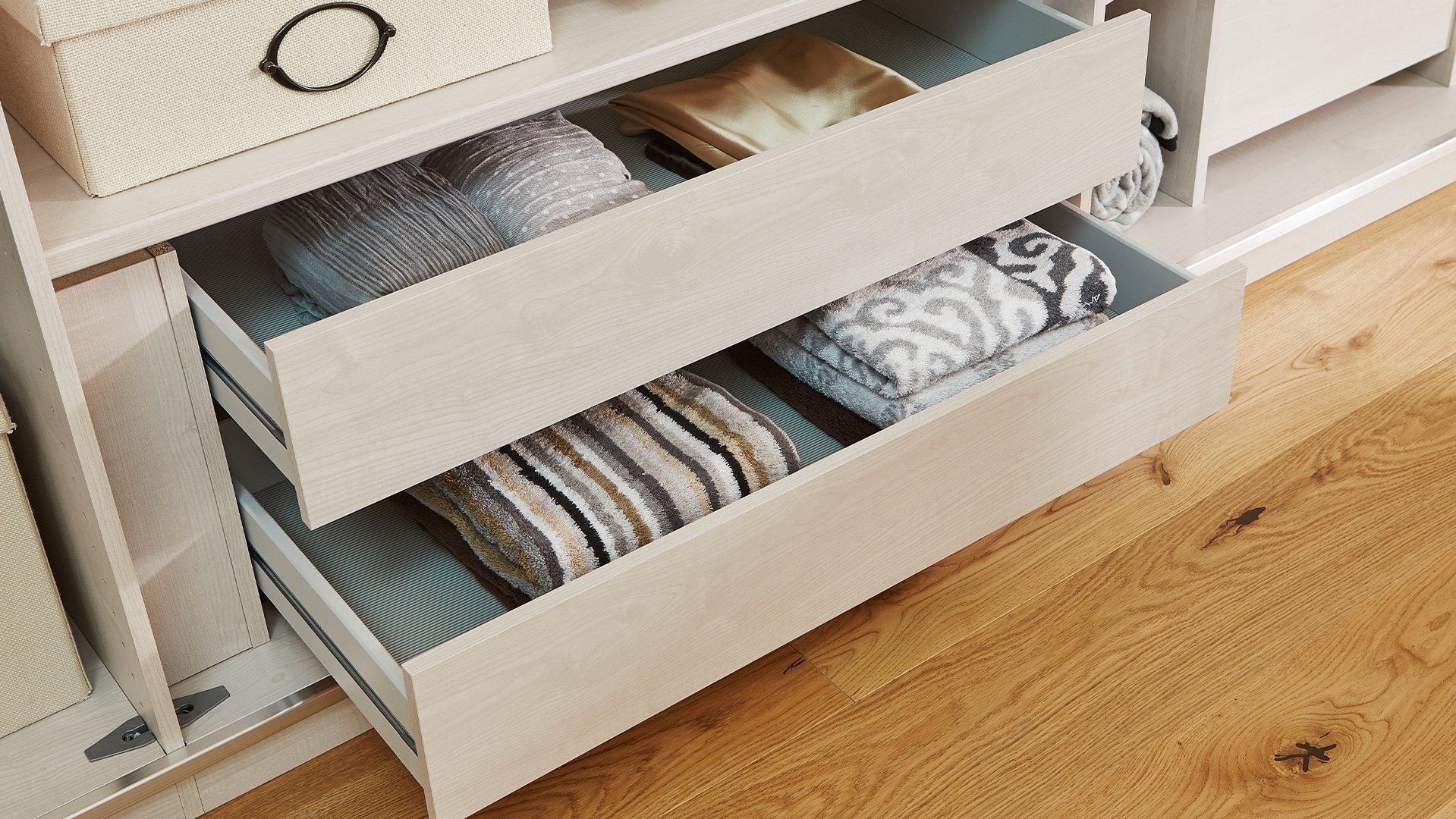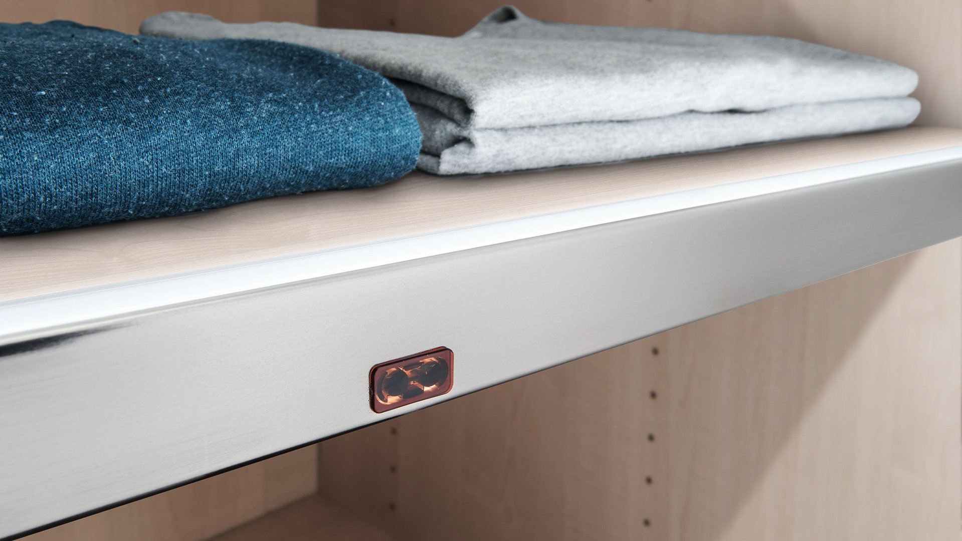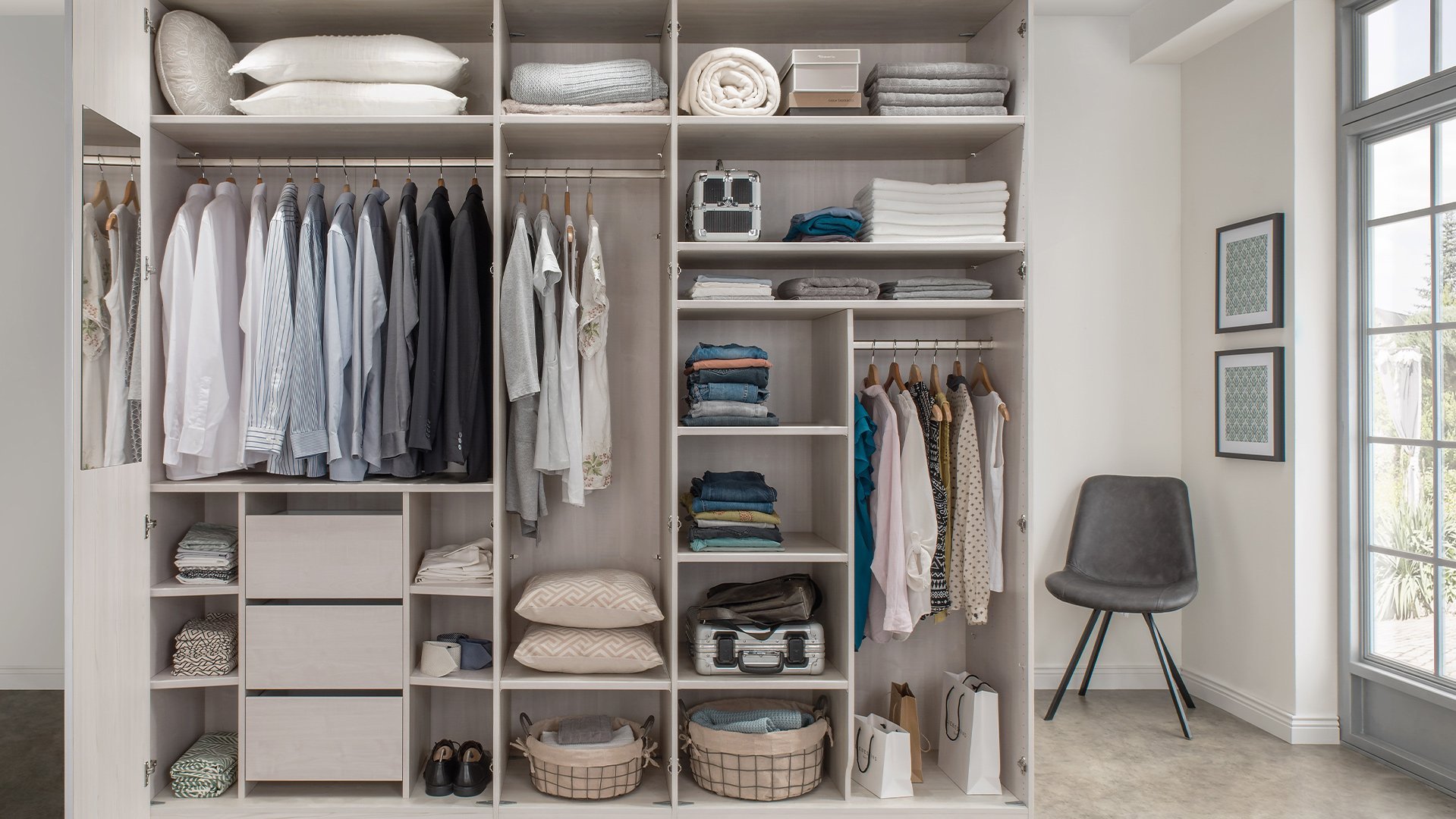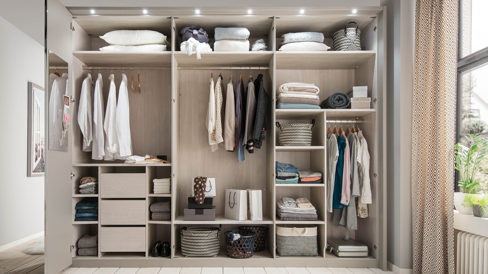 Jeder wünscht sich Ordnung in seinem Kleiderschrank. Wir helfen Ihnen, den Überblick zu behalten und bieten Ihnen zusätzliche Einlegeböden, Kleiderstangen und einen funktionalen Kleiderlift an. Socken und Wäsche lassen sich perfekt in einem unserer diversen Schubkasten-Einsätze, wahlweise mit Glas- oder Holzfront, unterbringen. Diverse Beleuchtungsmöglichkeiten setzen bewusste Lichtakzente in Ihrem Schlafzimmer. Weiteren Komfort erlangen Sie mit der USB-Steckdose, dem Krawatten- und Gürtelhalter/-auszug, dem Utensilienauszug, dem Schuhrost sowie zusätzlichen Dämpfern für Drehtüren. Als nützlich kann sich zusätzlich der platzsparende Innenspiegel erweisen.